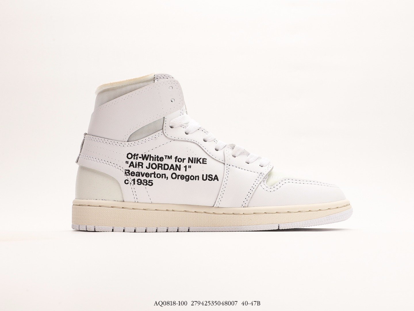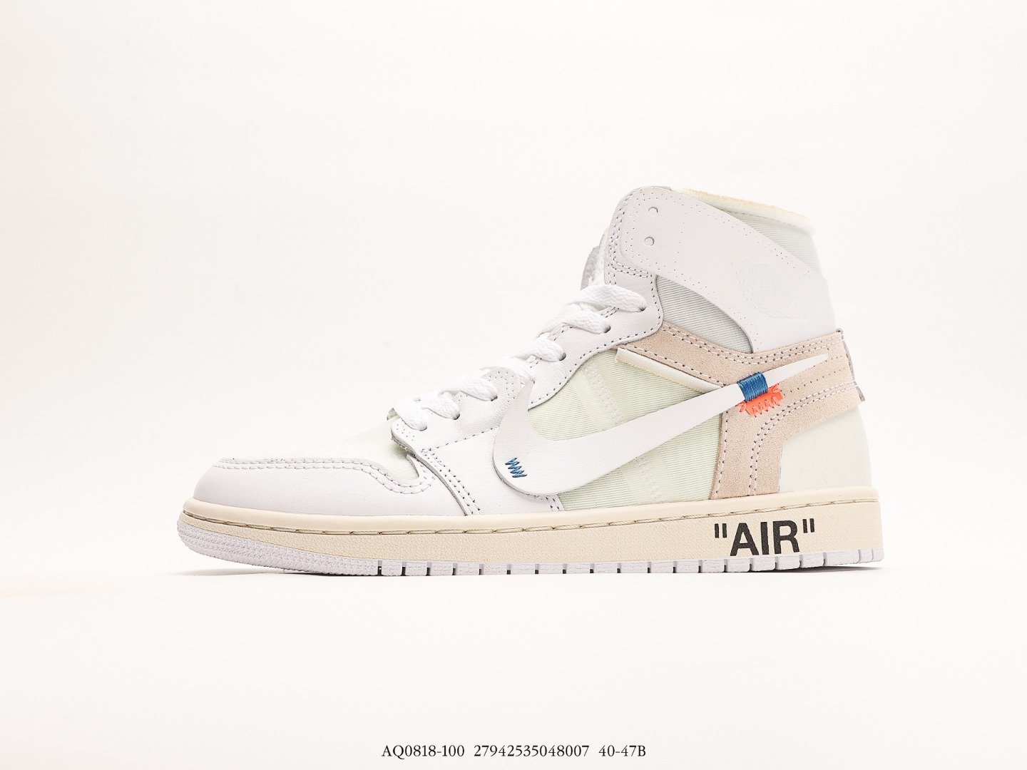 The Air Jordan 1 Retro High Off White White is made from a mix of rubber, leather, cotton and synthetic materials.This model of Air Jordan 1 is available in a white-on-white colorway. The sneaker’s upper is constructed of white leather and mesh with Swoosh branding on either side and blue accents. The shoe also has Wings logos on the ankles. It features orange tabs, black “AIR” lettering on the midsole, and black ‘Off-White™ for NIKE’ text on the side panels.The Air Jordan 1 Retro High Off White White was released on the 3rd of March 2018, and retailed for an original price of $190.