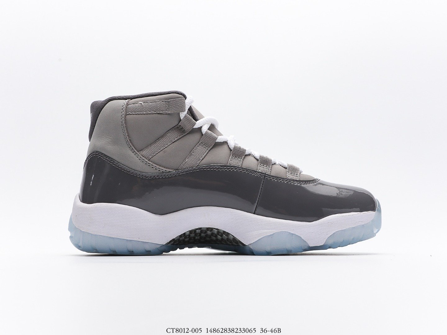 The Air Jordan 11 Cool Grey (2021) features a Cool Grey Durabuck upper with patent leather overlays and a signature Jumpman embroidery on the collar. From there, a white midsole and an icy blue translucent outsole complete the design.