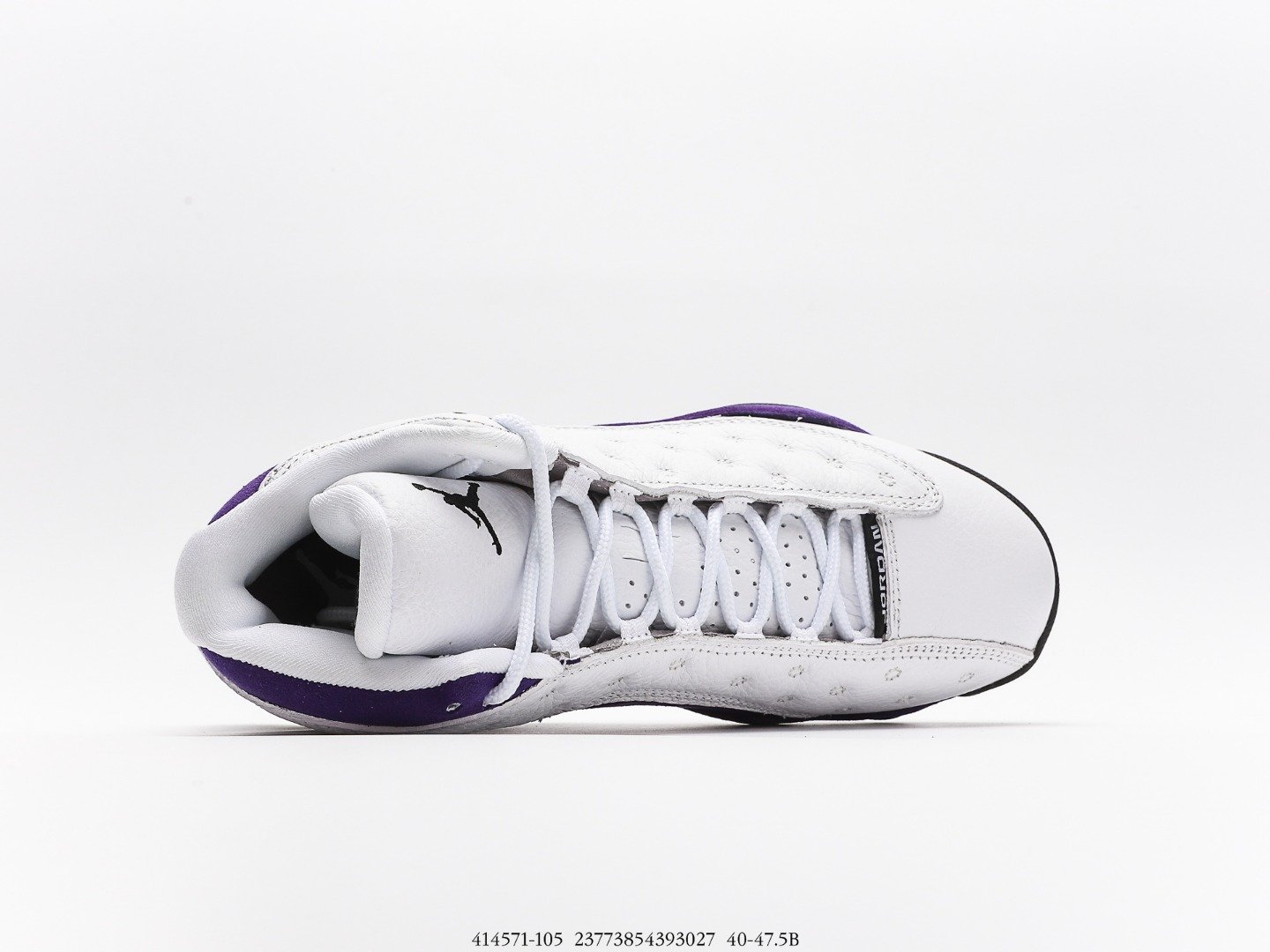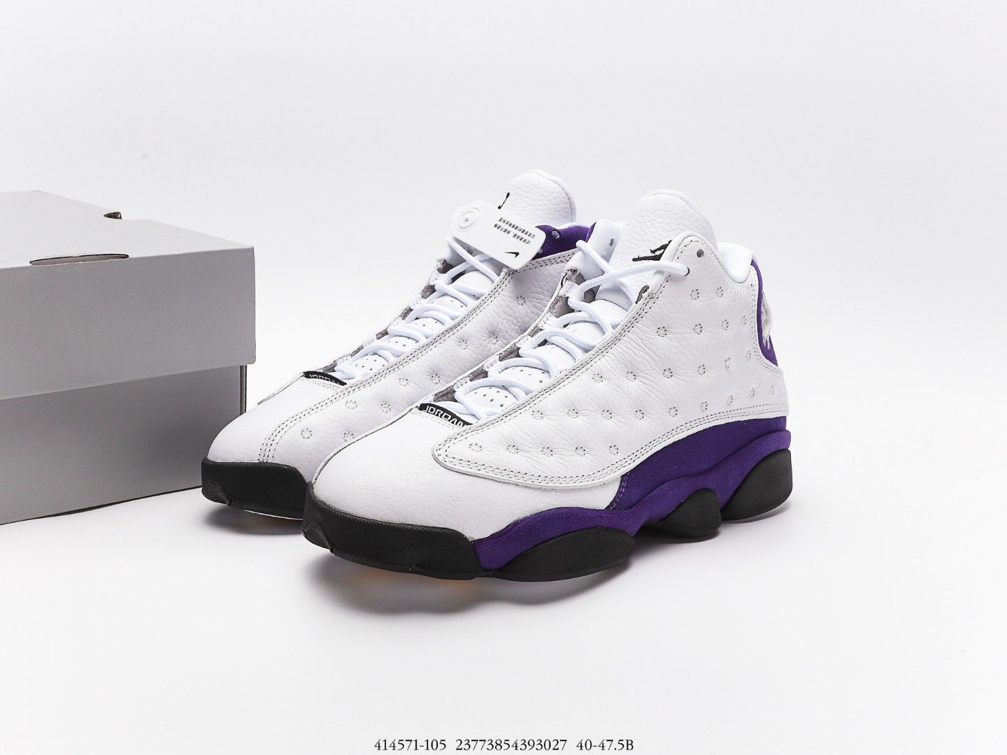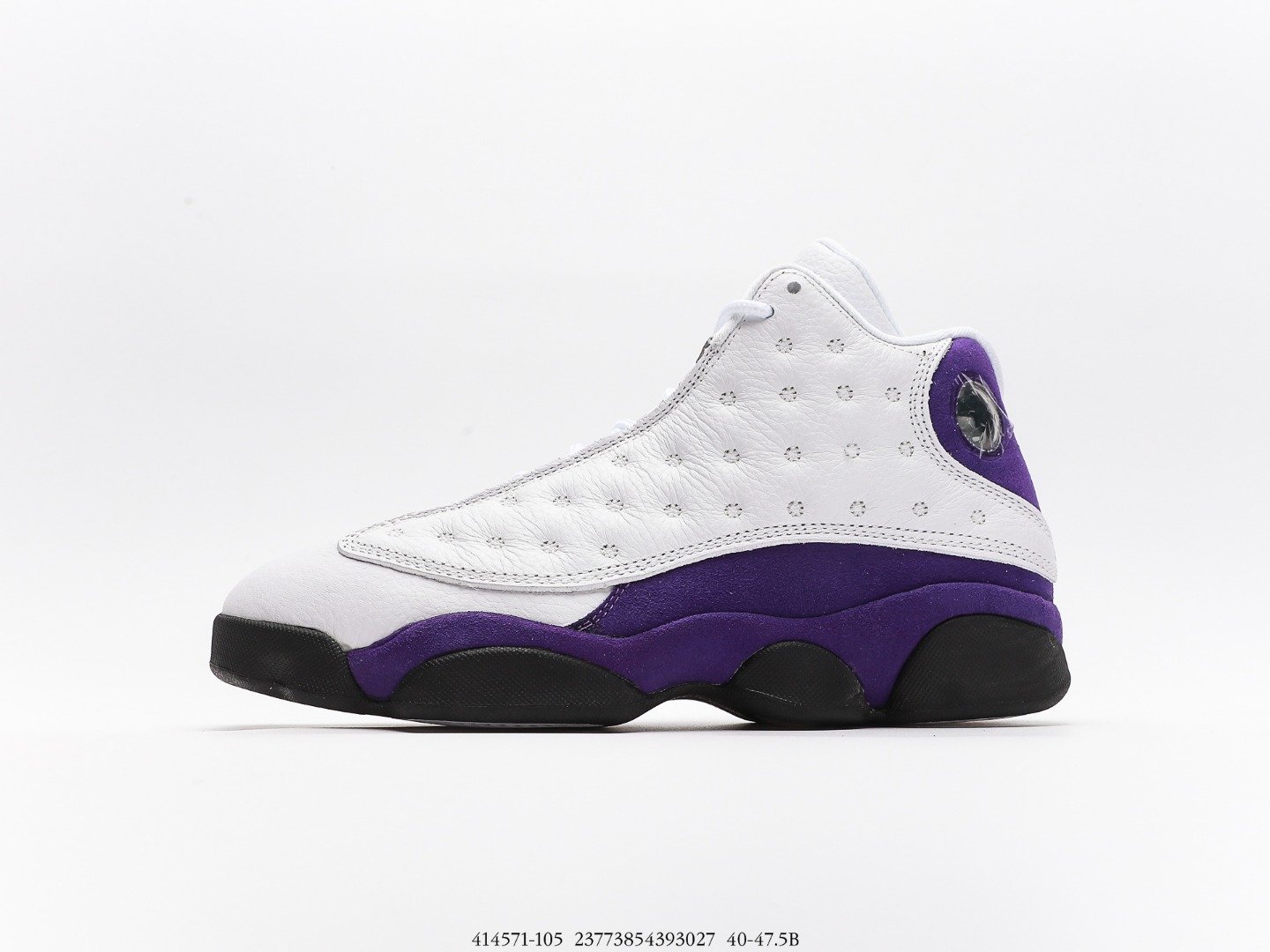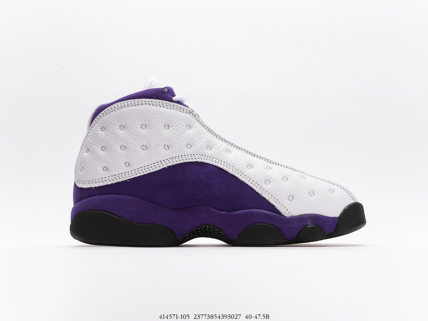 ​The Los Angeles Lakers’ colors are used in the color scheme to spice up Jordan’s 13th signature style. The upper is made of white tumbled leather, while the mudguard and heel are wrapped in purple suede as an accent. The design of these Retro Lakers sneakers is completed by a lateral heel-mounted hologram and a purple Jumpman sewn on the tongue. A black rubber outsole supports it.