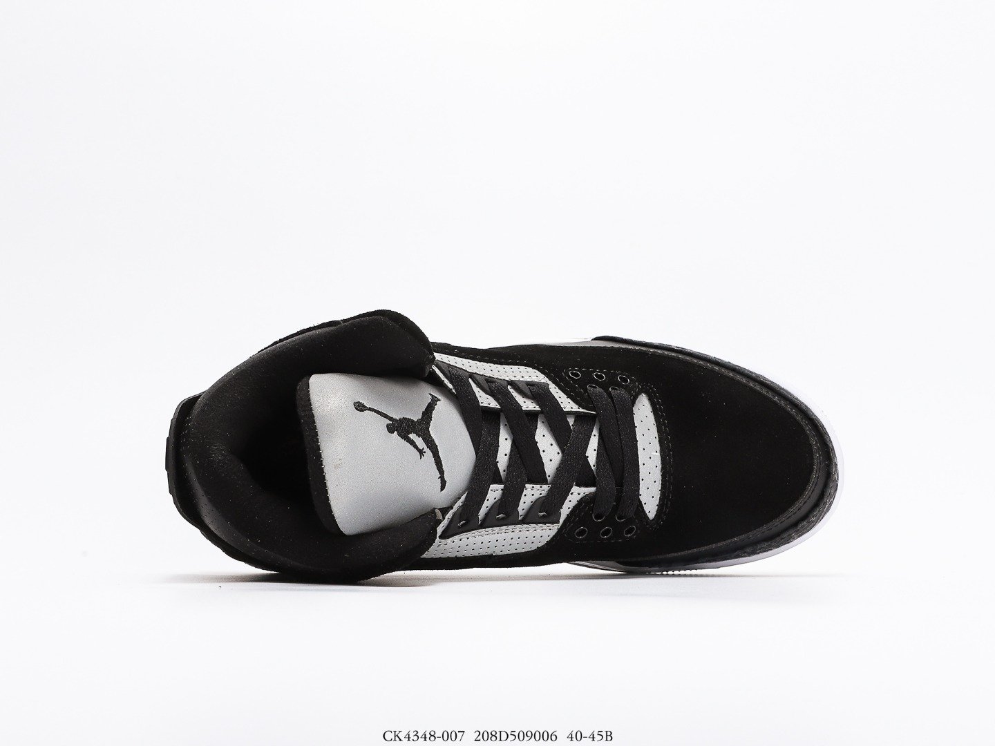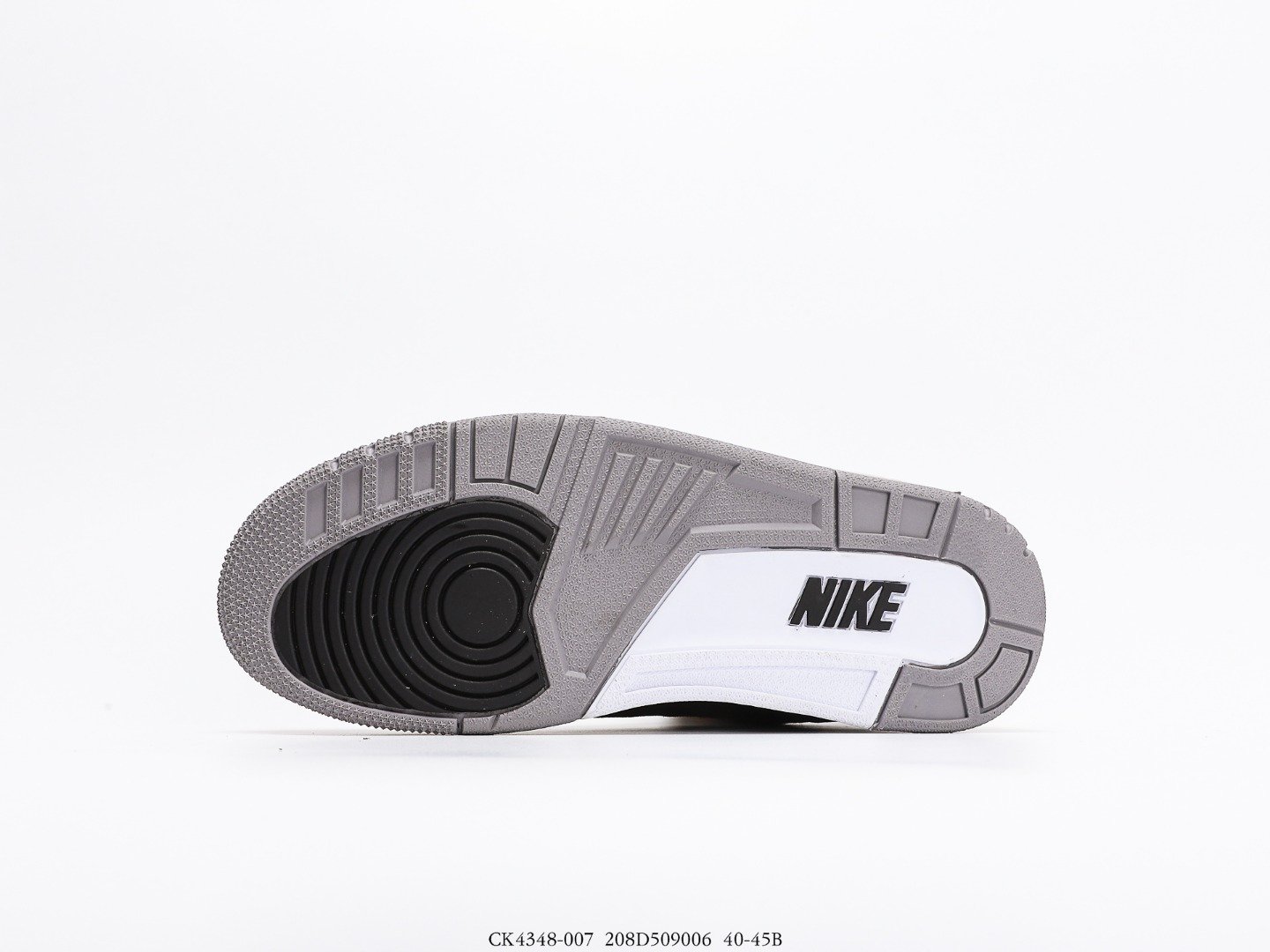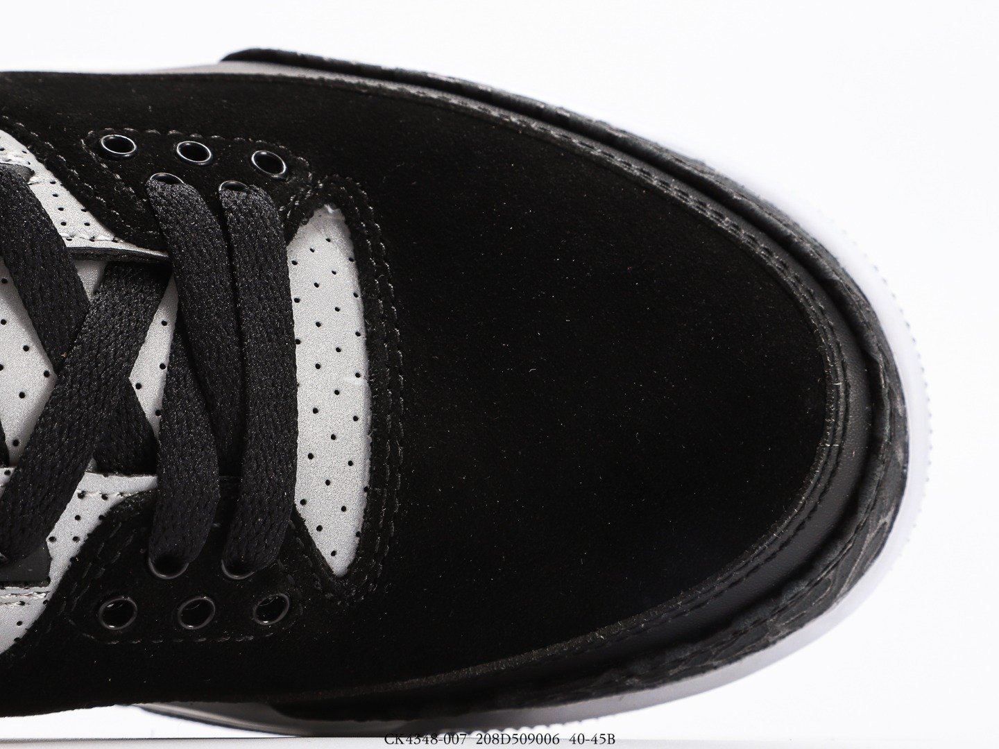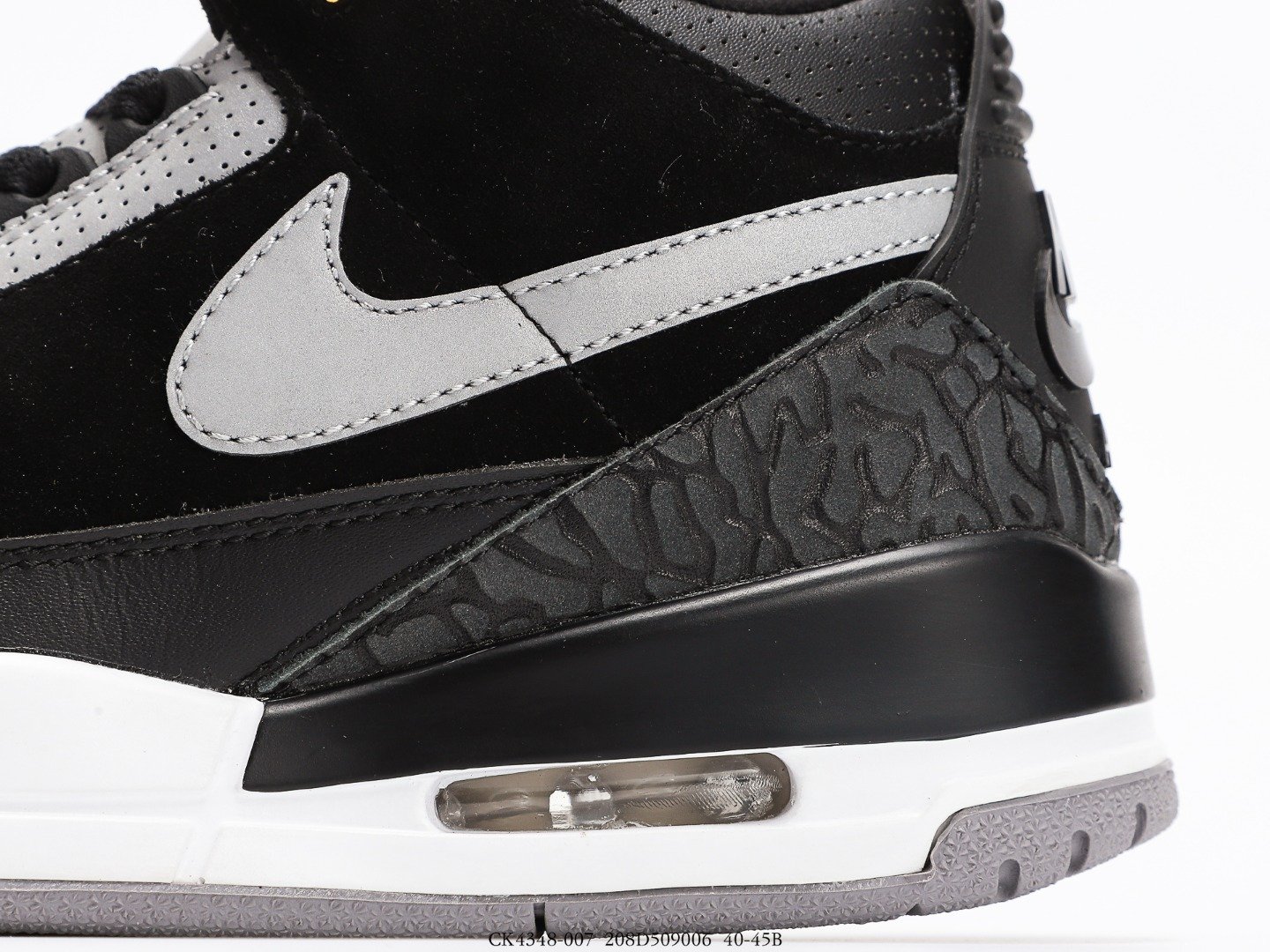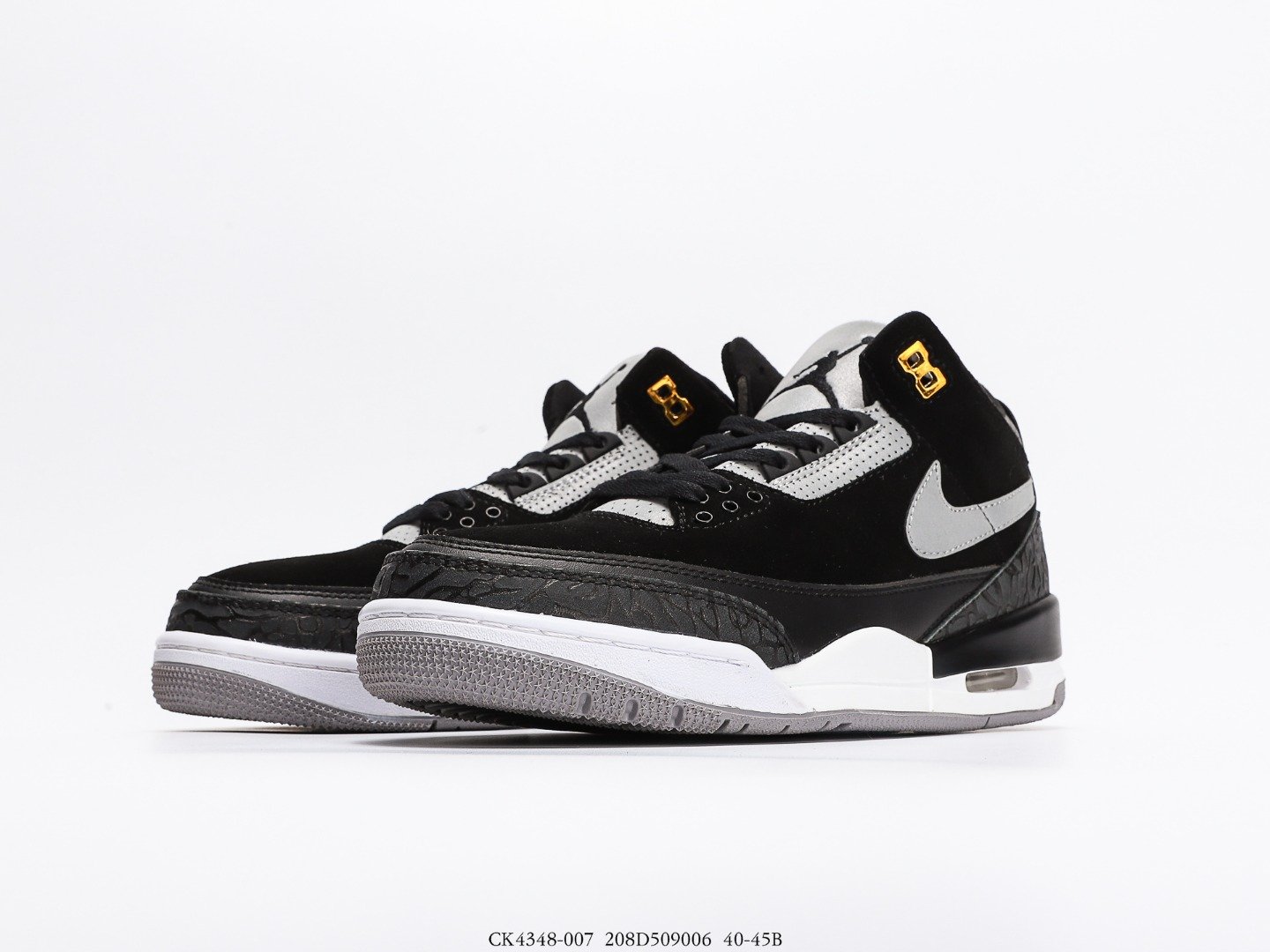 This Jordan 3 is a spin off of the classic “Black Cement” that has been a street favorite since its release in 1988. A black suede upper with a familiar elephant print mudguard is featured, but instead of the elephant print sporting grey tones, it is black. A grey Swoosh overlays the upper, drawing inspiration from Tinkers first projects for Nike. A white midsole, grey outsole, and gold hardware completes the design. These sneakers released in July of 2019 and retailed for $200.