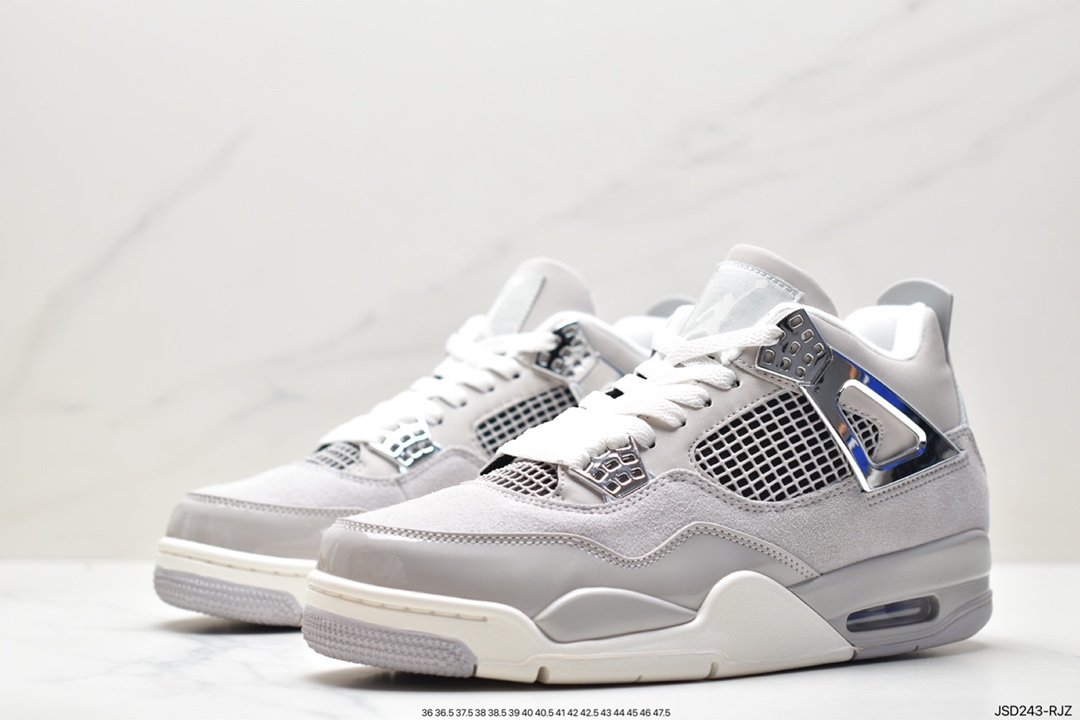 Crafted with precision, the sneaker flashes a blend of light iron ore, sail-neutral grey, black, and metallic silver, bringing a balanced and understated aesthetic to the iconic Jordan 4 silhouette. The defining feature is its meticulous craftsmanship and the fusion of these nuanced colors with suede and leather overlays on the upper. The iconic wings on the side panel boast a flashy metallic silver hue that make the sneaker pop.
