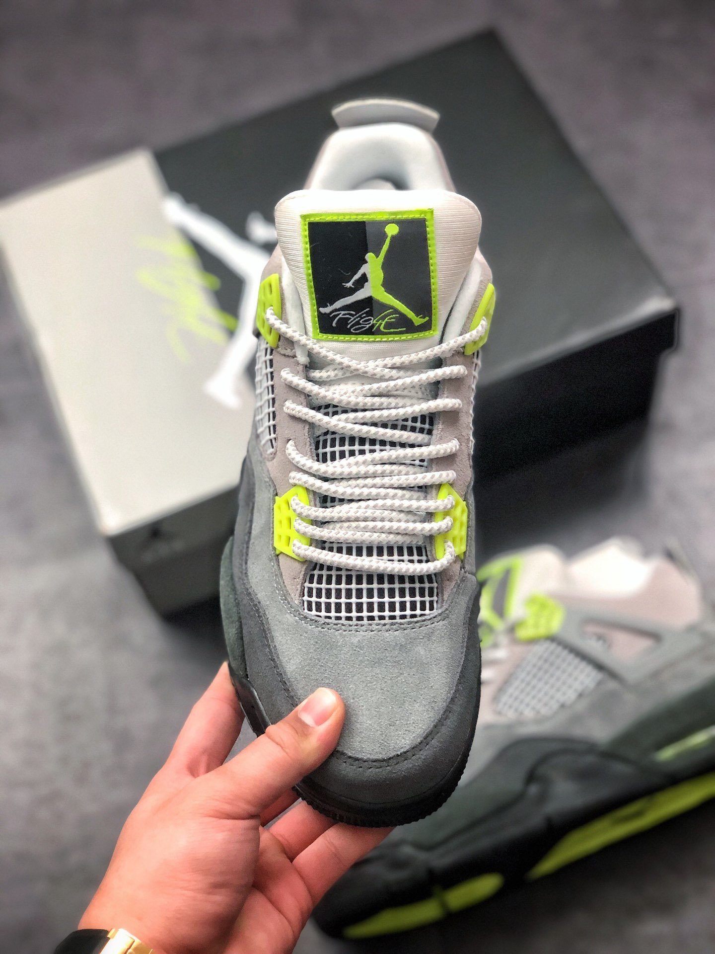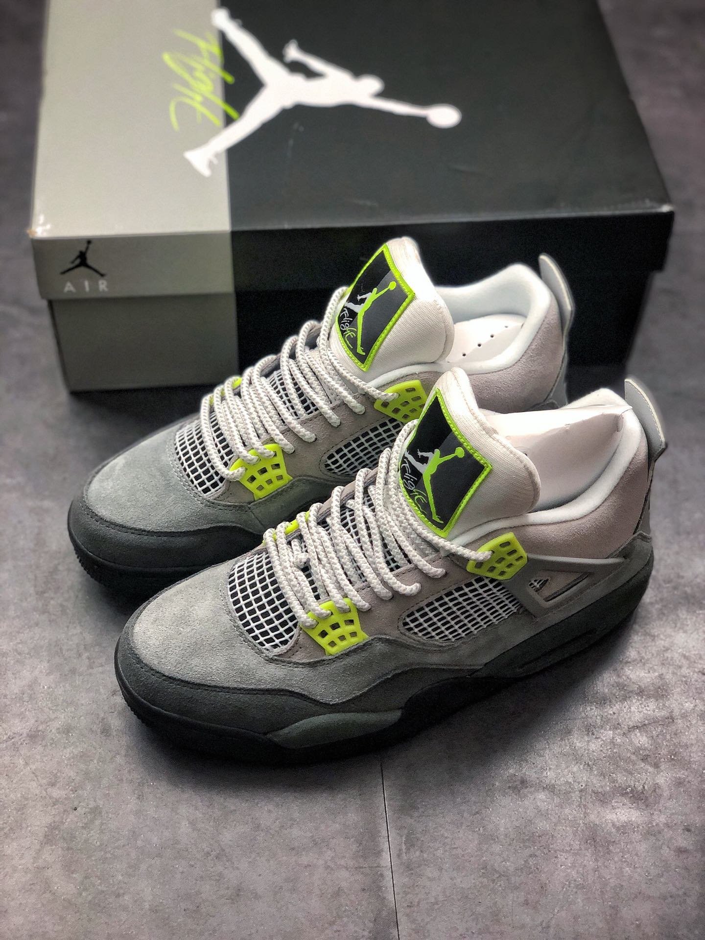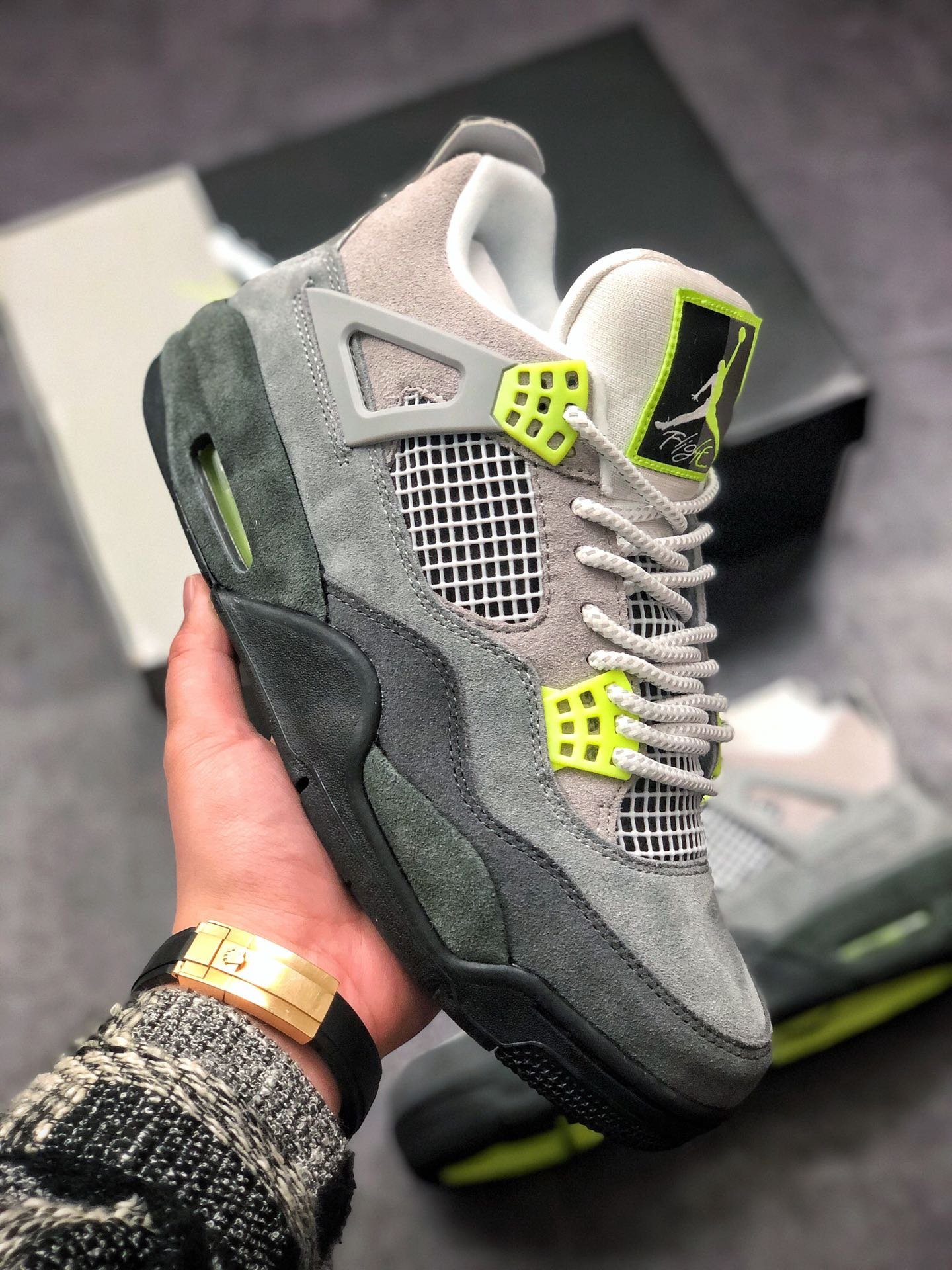 This Jordan 4 is composed of a tonal grey upper with white netting underlays and neon detailing. A split-color Jordan Flight patch on the tongue, black sole, and patterned laces complete the design. These sneakers released in March of 2020 and retailed for $225.