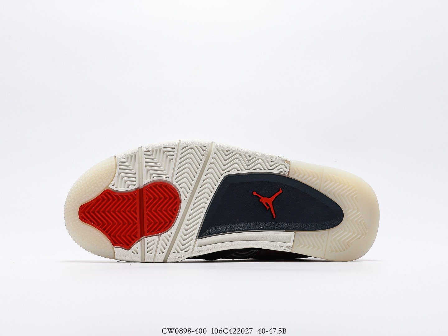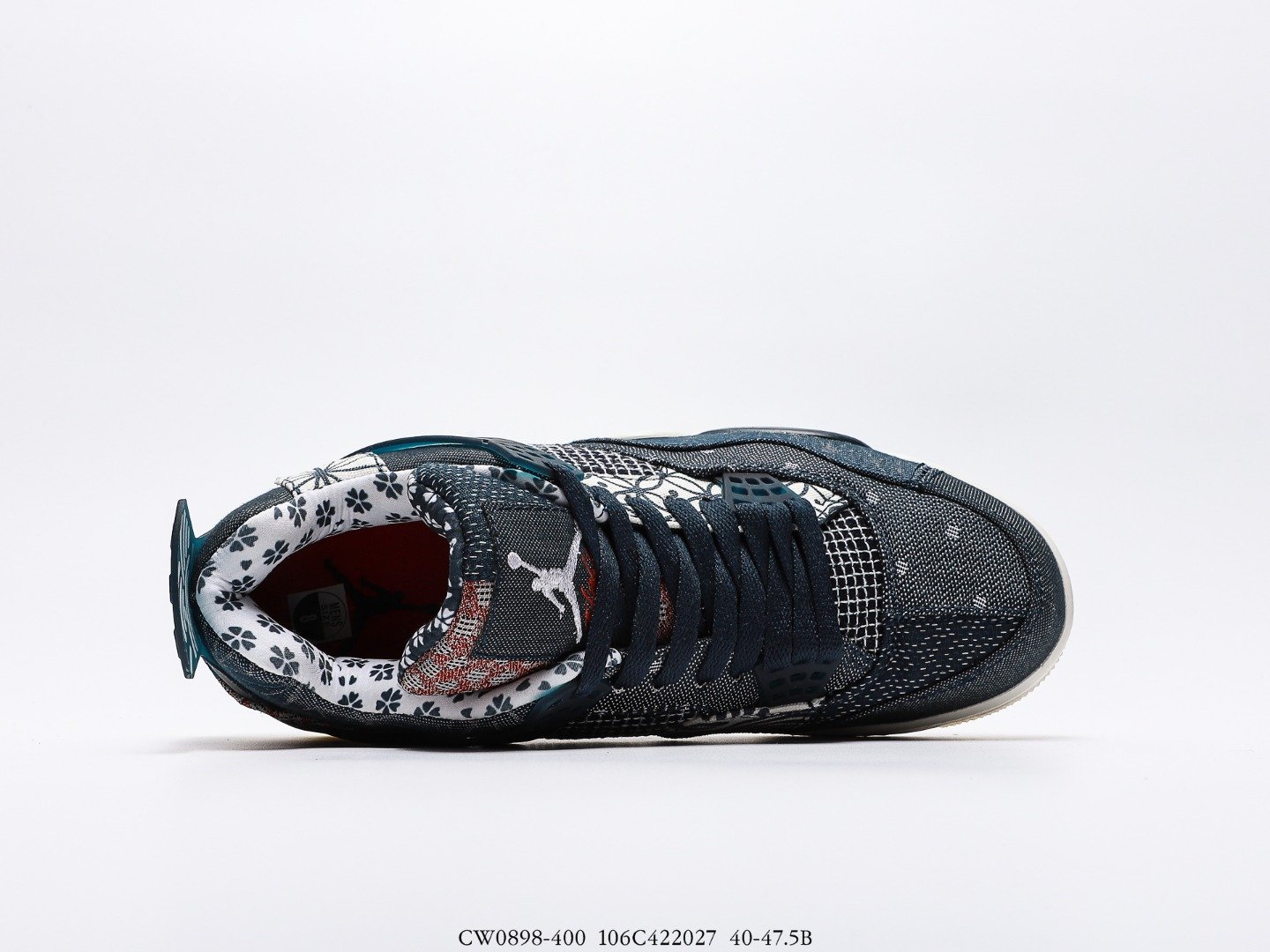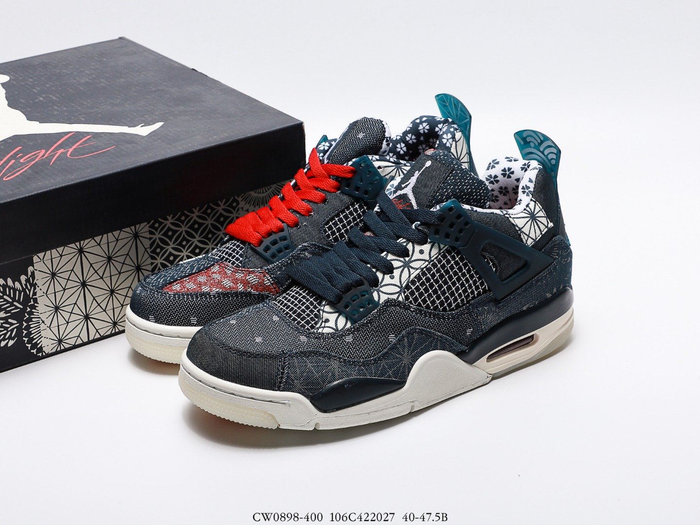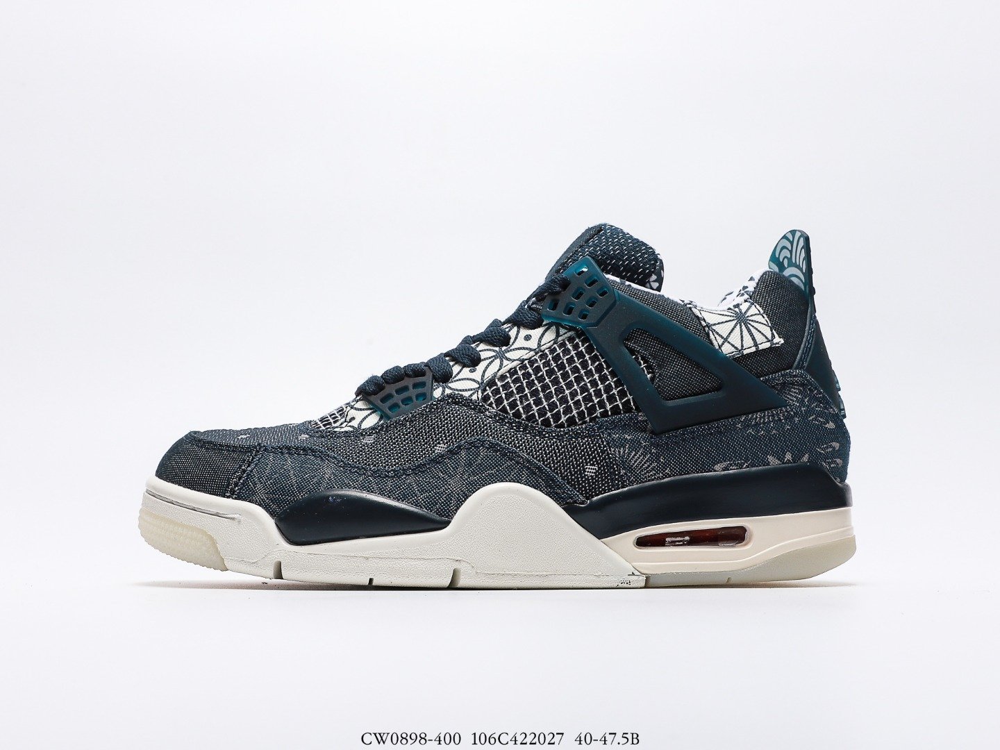 This Retro Air Jordan 4 sneaker is crafted from a quilted patchwork, which gives it a twill and canvas look. There are visible small accents of Sail and Fire Red plus Deep Ocean Blue on the upper of this shoe. There is also a Jordan logo at the rear of this model. The sneaker also features a greyish lacing system.