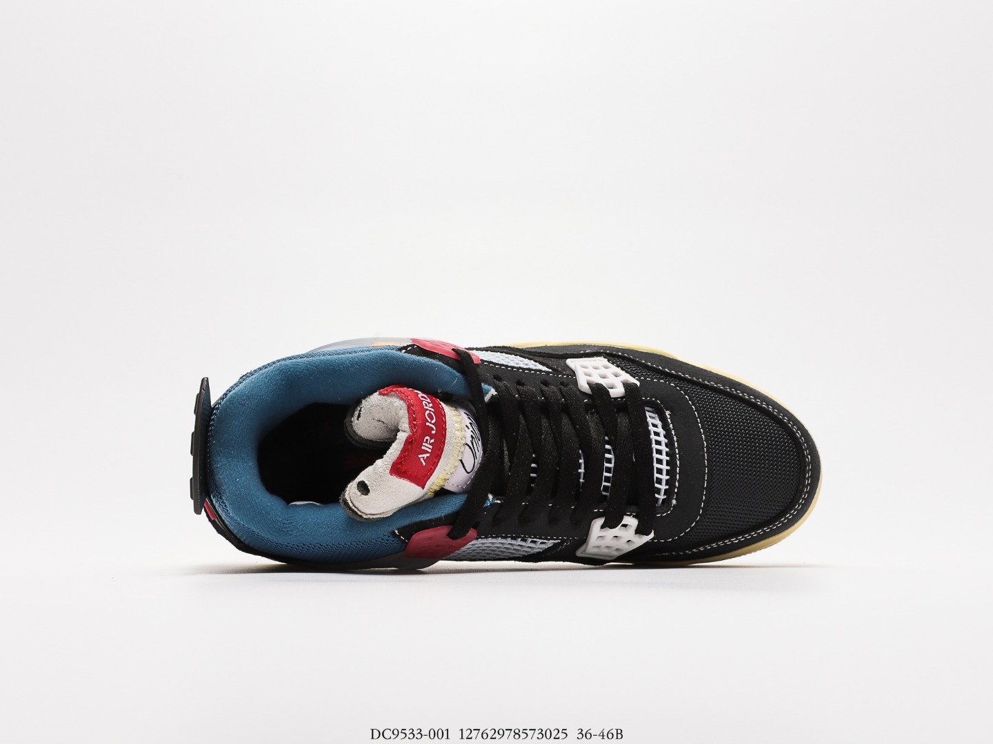 The Air Jordan 4 Union LA Off Noir features a mixture of materials and colors. The upper is constructed out of black, white, and blue mesh, suede, and nylon. Hits of, what looks like infrared, can be found on the Nike Air heel and the tip of the wings. These Union Jordans dropped in August of 2020 and retailed for $225.