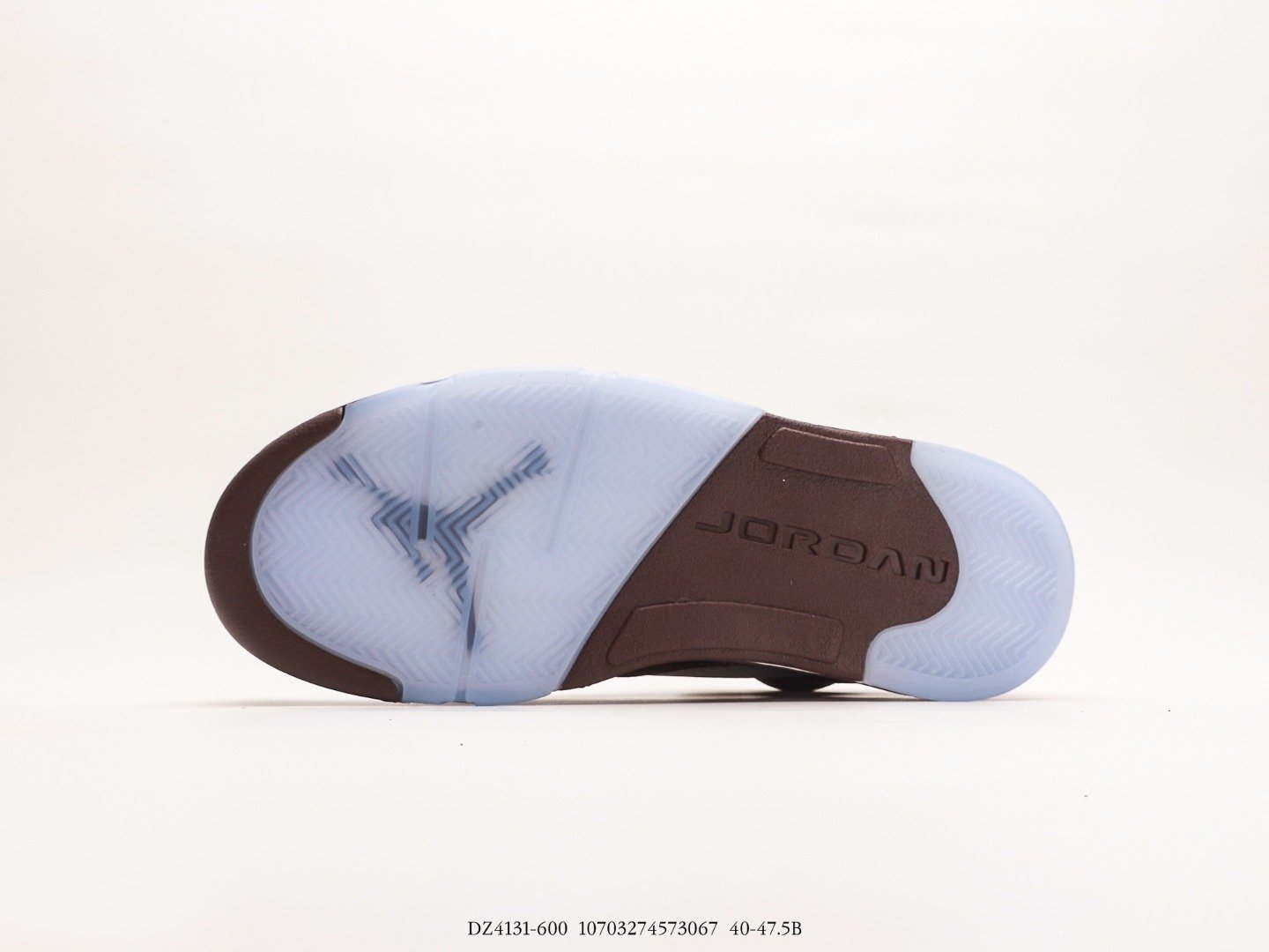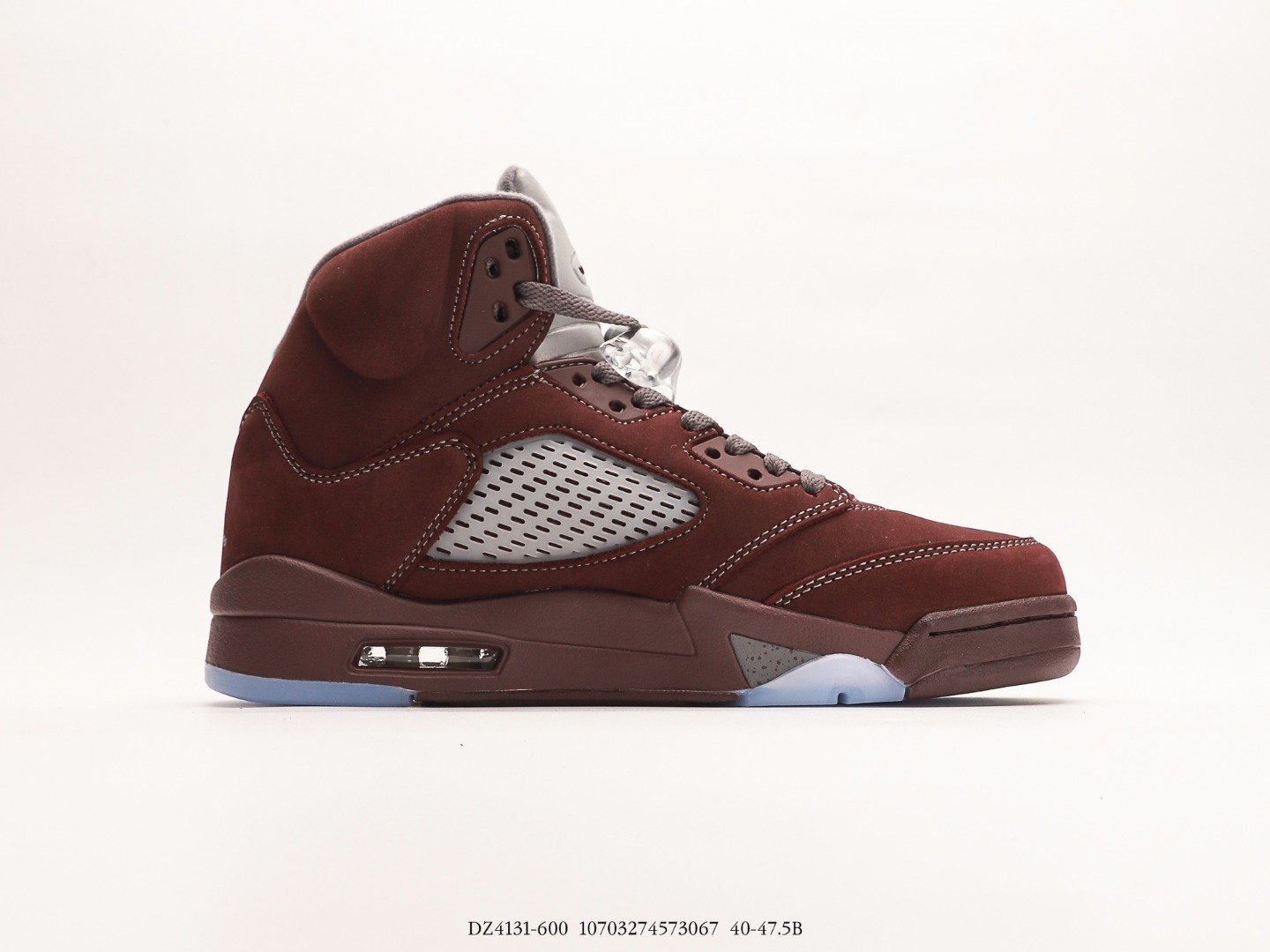 The (2023) Burgundy Jordan 5 Retro incorporates a burgundy suede upper, complemented by contrasting stitching and transparent netting on the quarter panel for enhanced breathability. The heel overlay and tongue are adorned with embroidered Jumpman branding, featuring a reflective silver finish to enhance visibility in low-light situations. A polyurethane midsole in a matching color showcases speckled shark-tooth accents, and houses a visible Air-Sole unit in the heel for cushioning. The outsole, featuring a translucent herringbone traction pattern, ensures dependable grip on various surfaces.