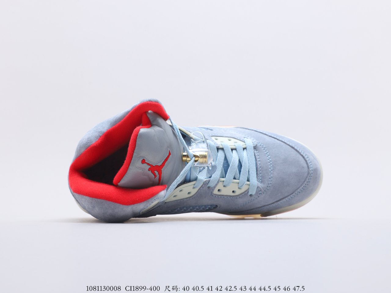 The Air Jordan 5 Retro Trophy Room Ice Blue comes in Ice Blue and University Red-Sail-Metallic Gold colorways.