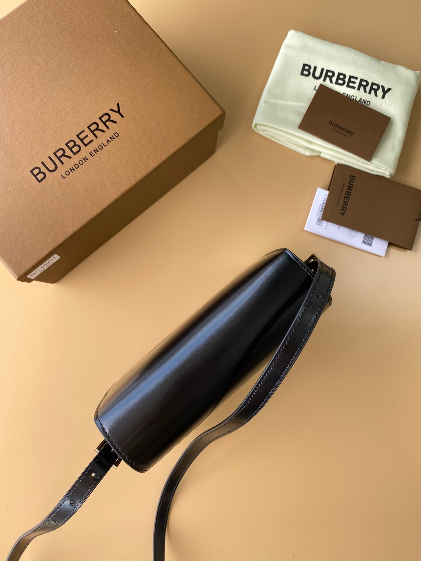 Black leather shoulder bag with packaging box