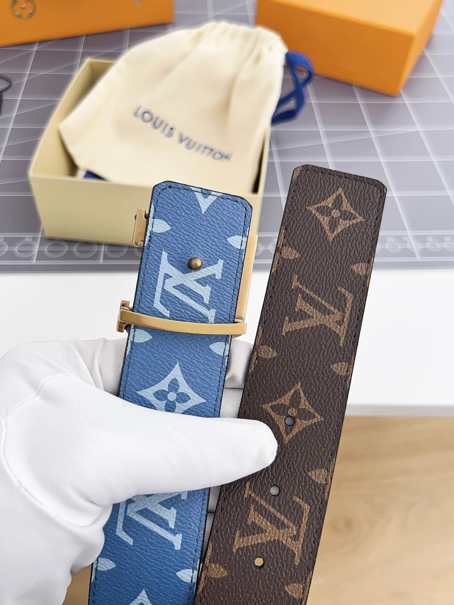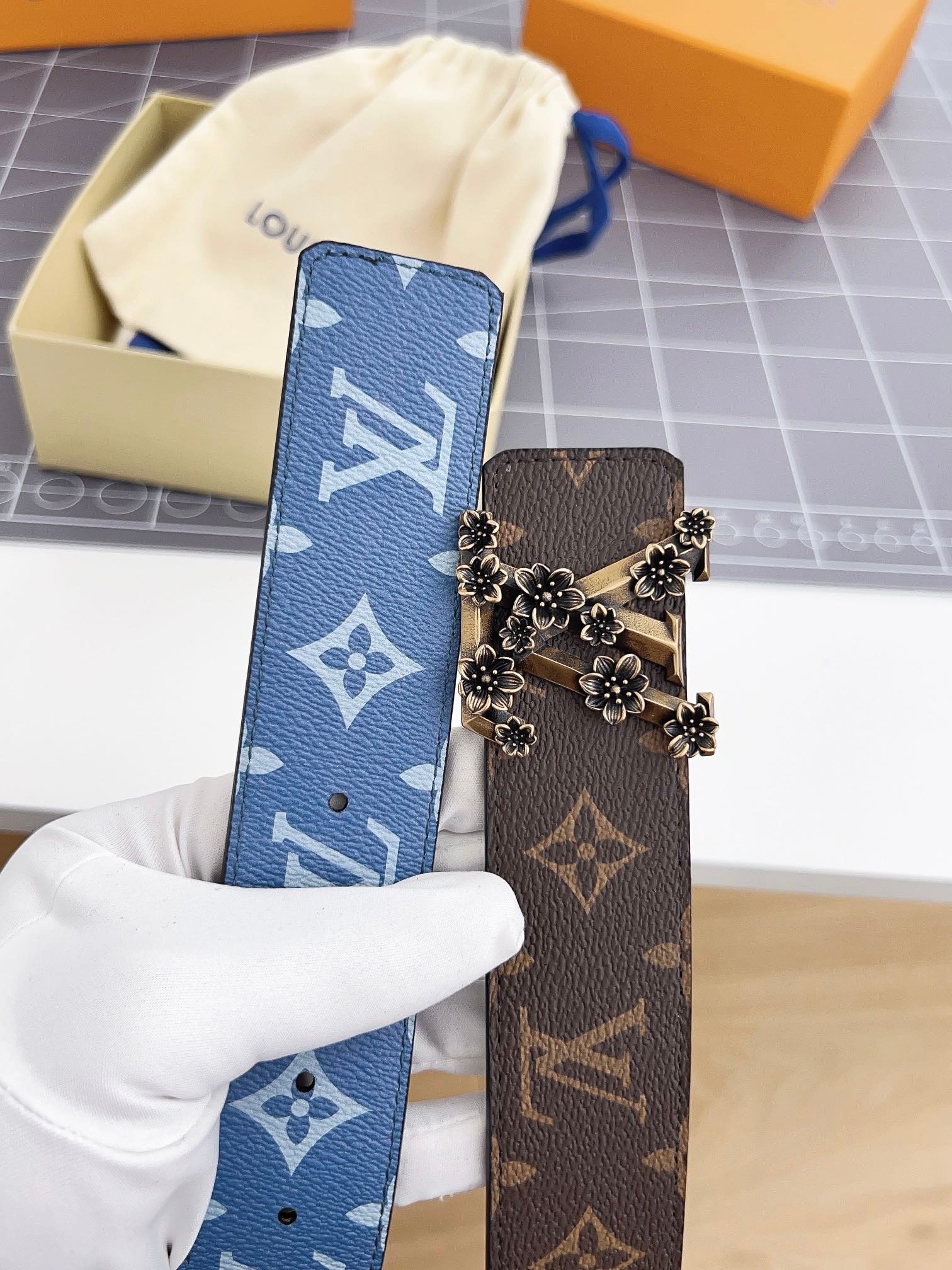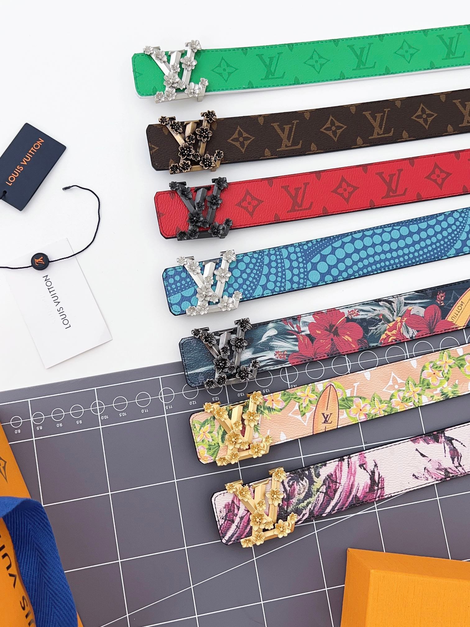 Light-colored Louis Vuitton belt with a dragonfly buckle