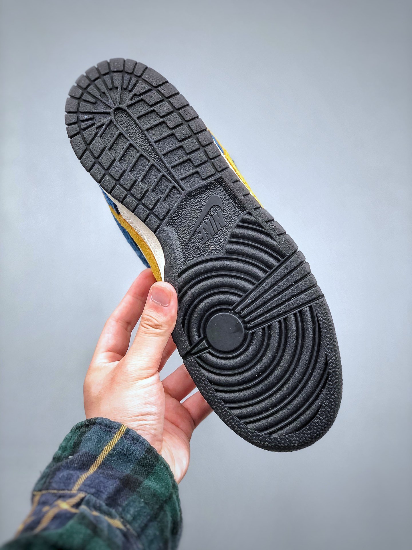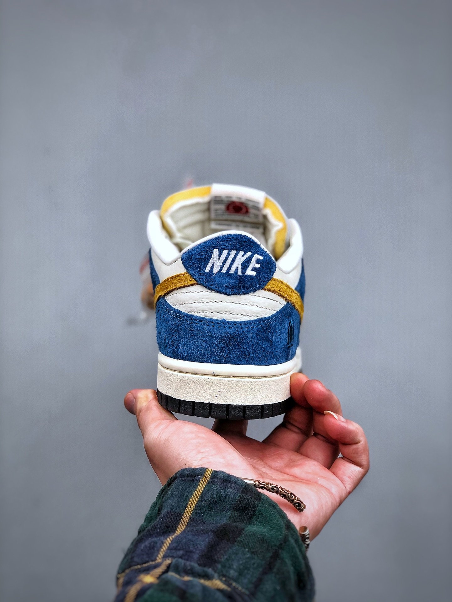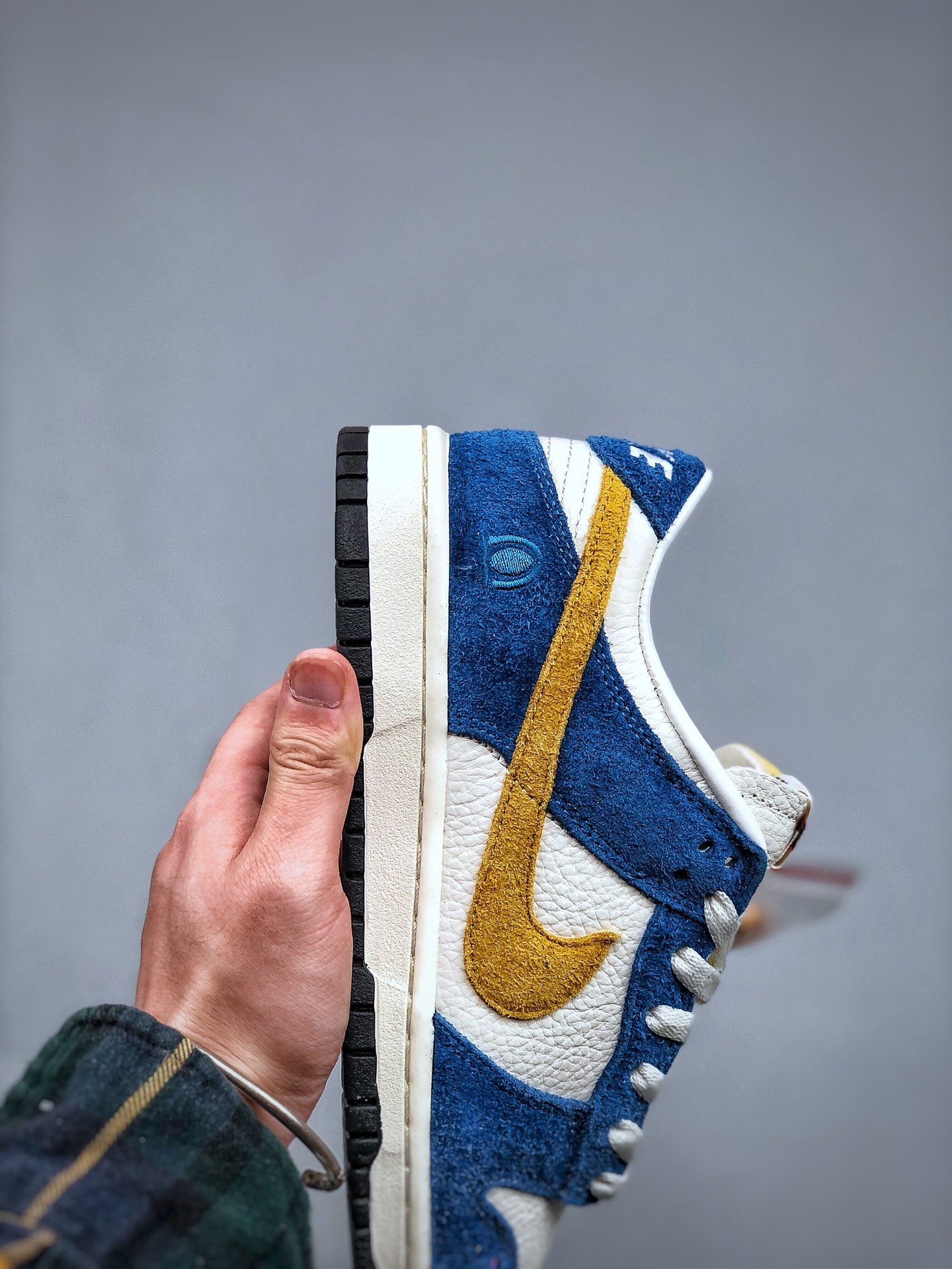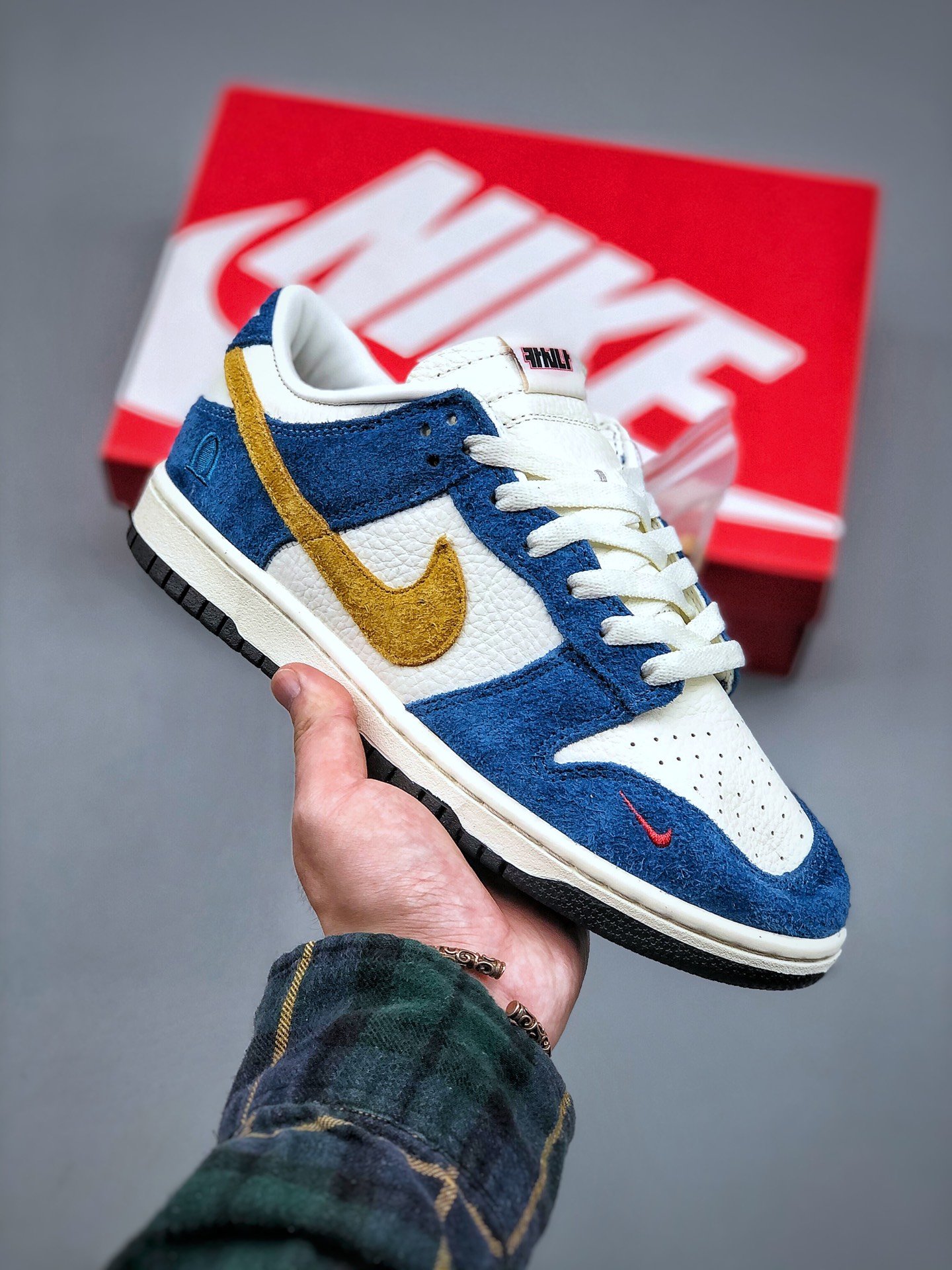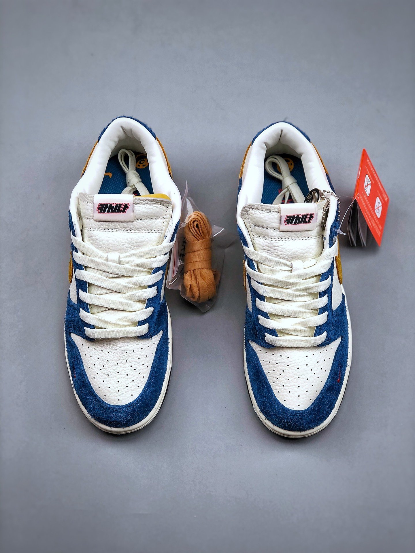 The Nike Dunk Low Kasina Industrial Blue features a white tumbled leather upper with Industrial Blue suede overlays and a yellow Swoosh. Kasina branding on the tongue, embroidery on the side heel, and an orange mini Swoosh on the toe complete this luxe design.