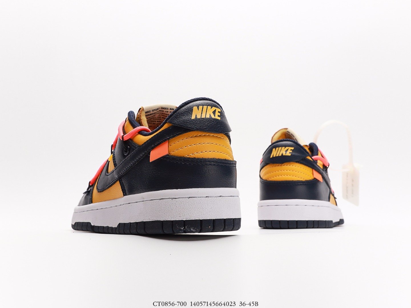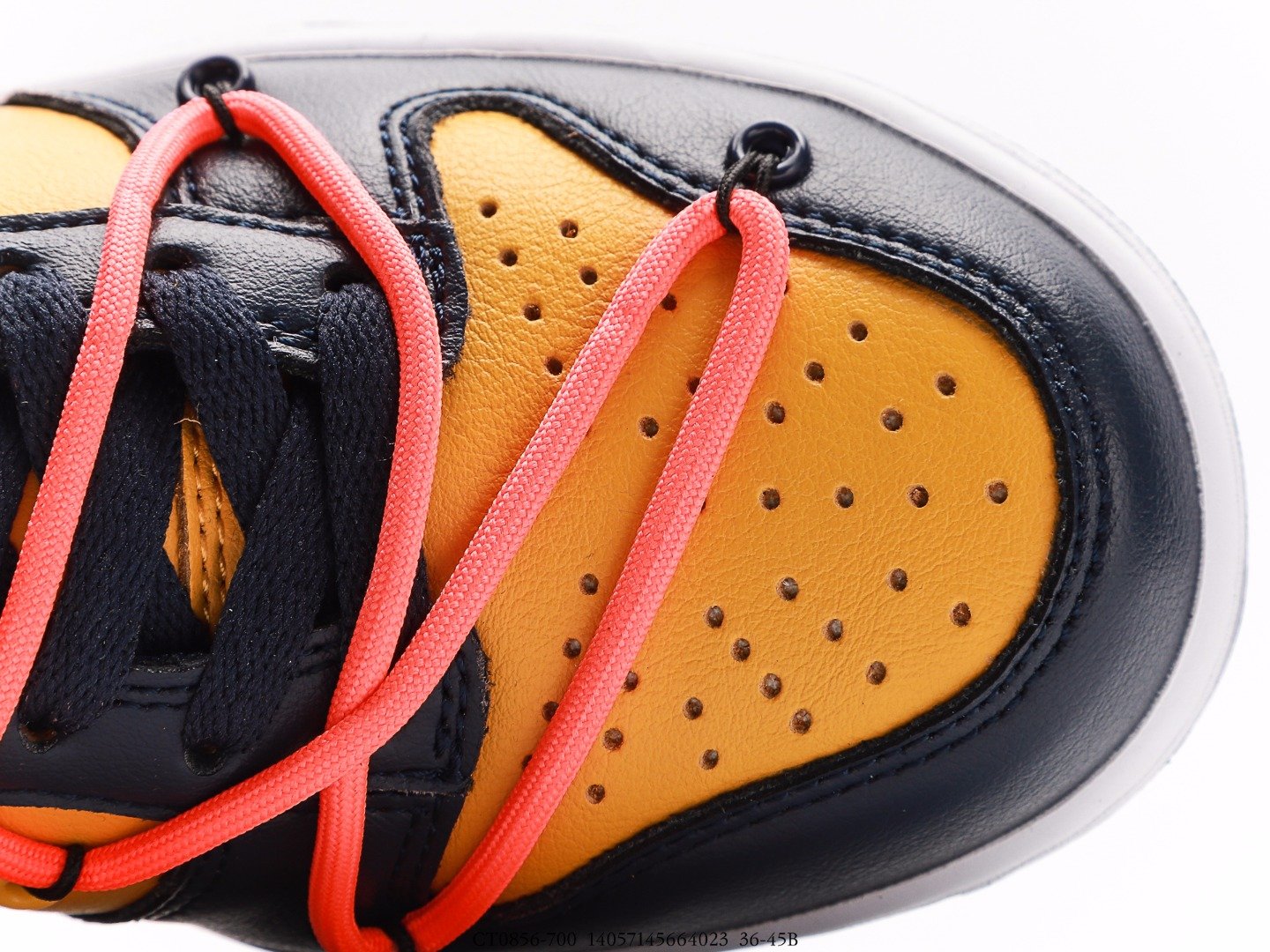 This Dunk Low is comprised of a university gold leather upper with midnight navy overlays. A unique secondary lacing system, zip-ties, and signature Off-White text on the sides completes the design. These sneakers released in December of 2019 for $170.