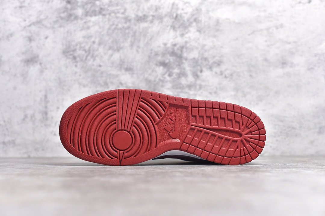 This is a pair of red and white Nike Dunk Low sneakers, featuring a high-quality leather upper and the classic black Swoosh logo, making them look stylish and energetic. The design of the shoes is simple and elegant, with white laces complementing the red and white upper. The brand logo on the tongue highlights their authentic identity. The red rubber outsole provides good wear resistance and traction, making them suitable for daily wear and sports. The blue shoebox next to the shoes has the Nike logo and product information printed on it, further highlighting the brand's premium image.