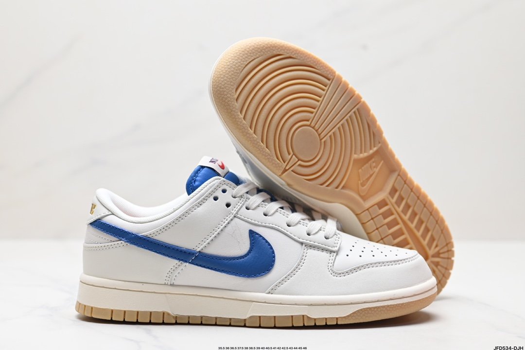 The Nike Dunk Low SE Sail Dark Marina Blue is dressed in a color pattern of Dutch blue, white, and dark marina blue.
