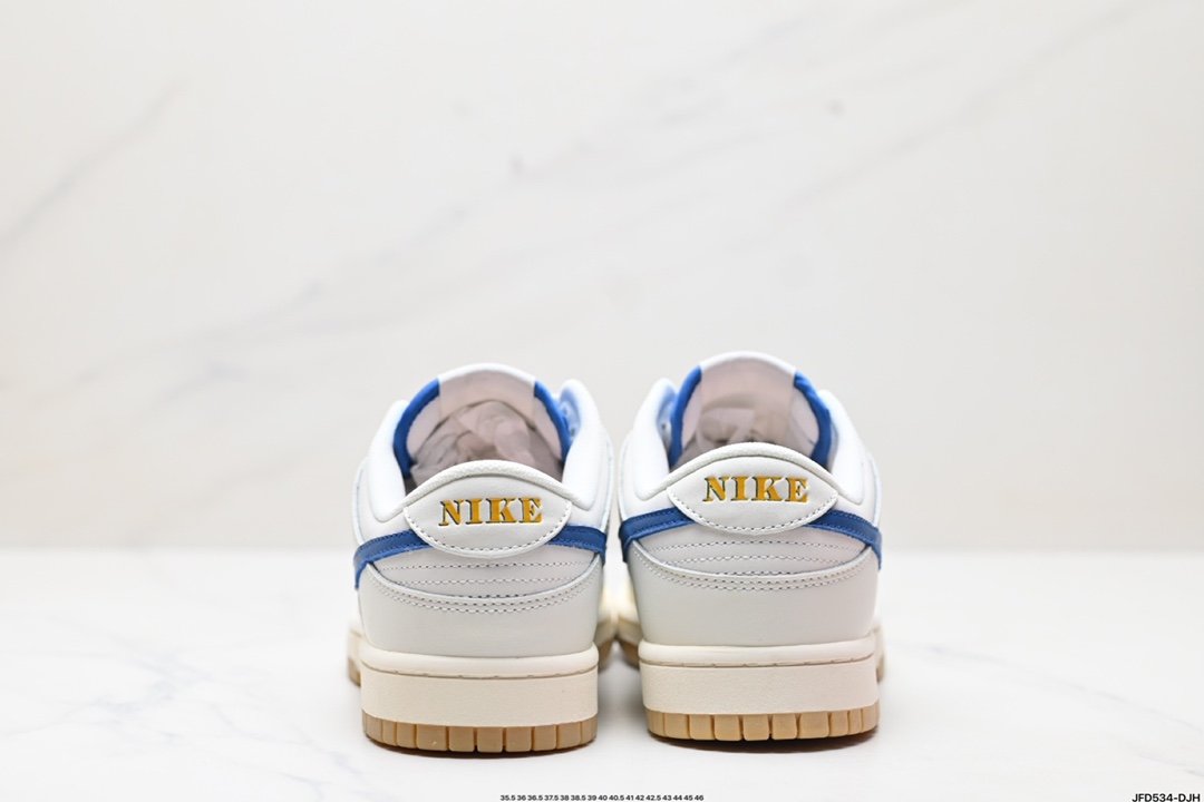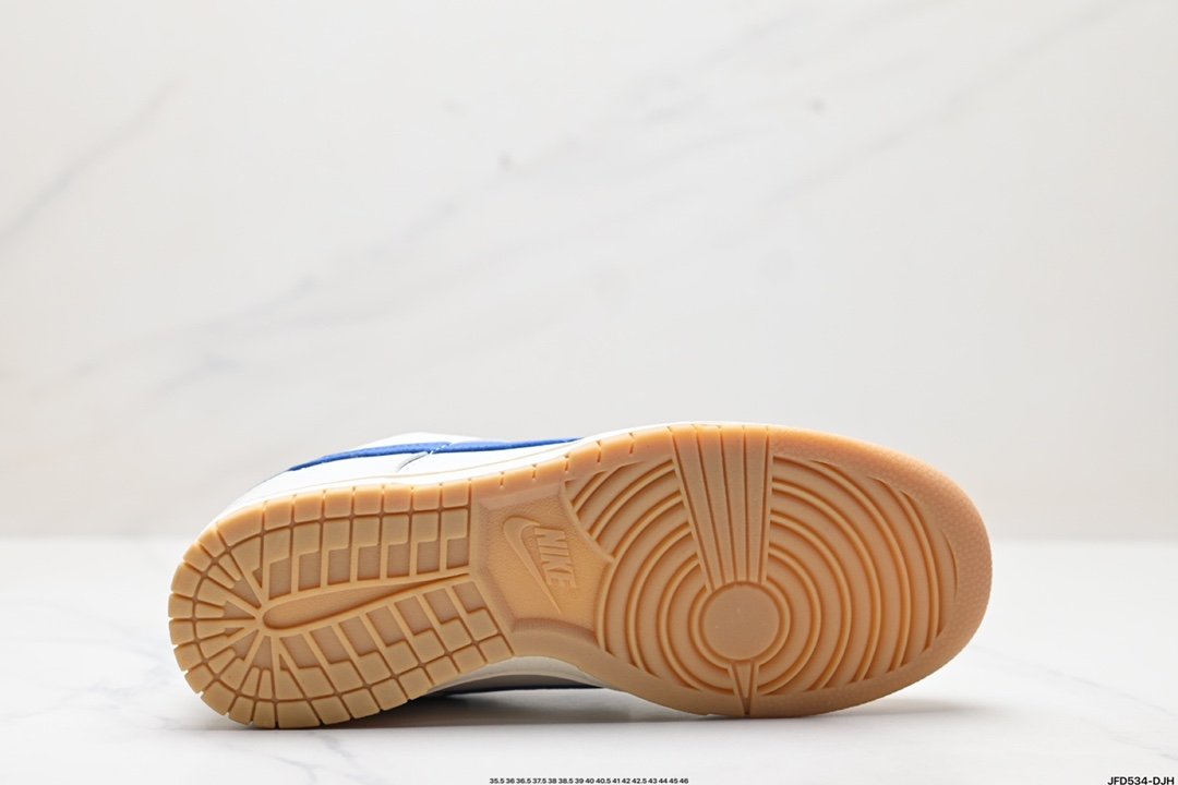 Sail, gum light brown, and gum royal make up the shoe’s colorway. This sneaker’s sail white leather upper is accented by blue mesh tongues and tumbled leather Swooshes. It has a white leather base with white leather overlays, laces, tongue tags, and yellow heel branding. The design is finished with tongues, insoles, and heels that have the Nike branding, a sail midsole, and a gum rubber outsole.