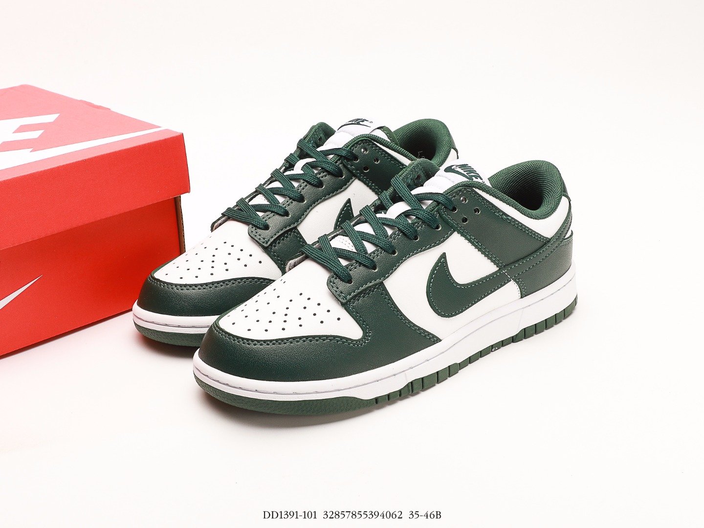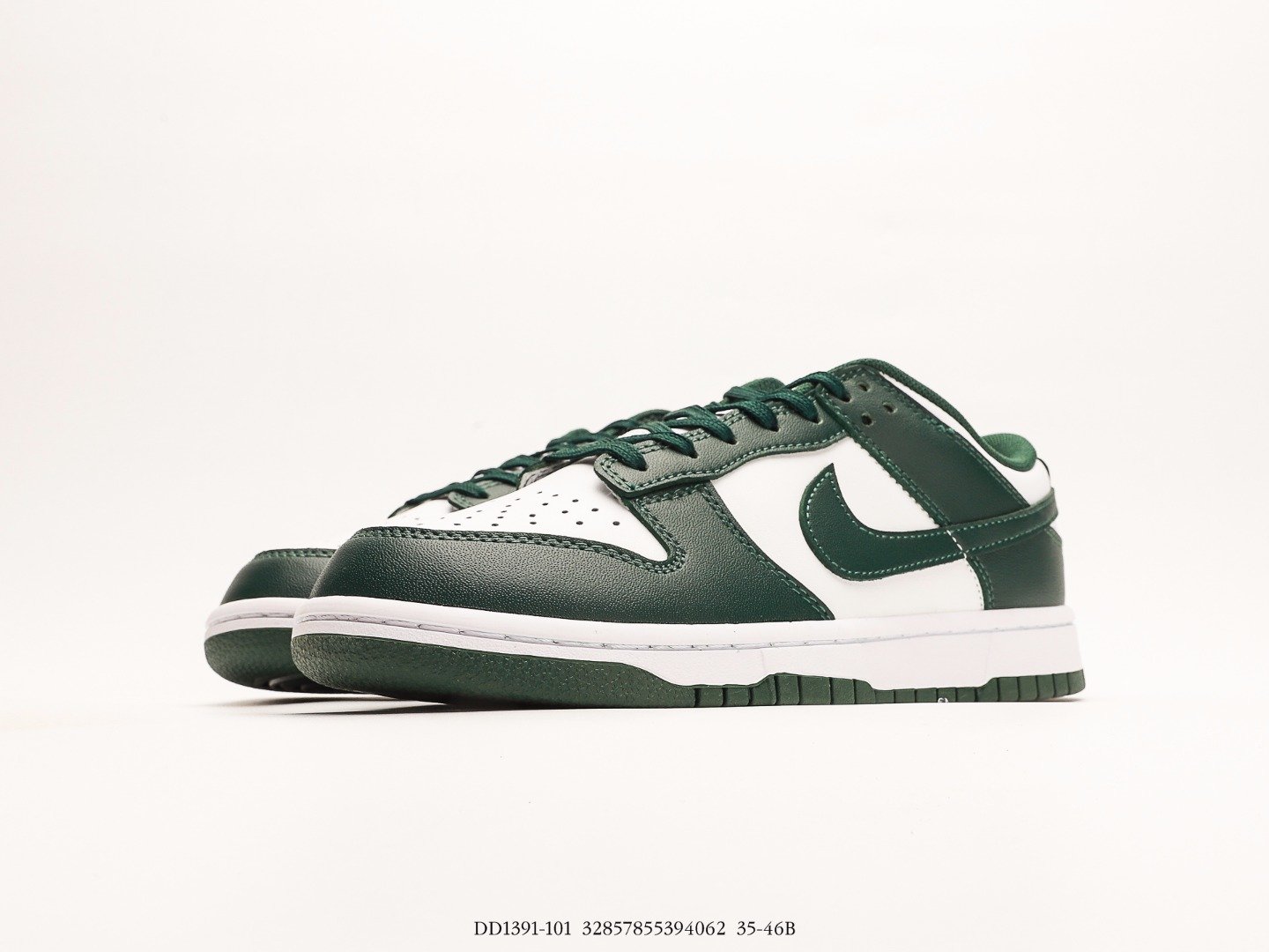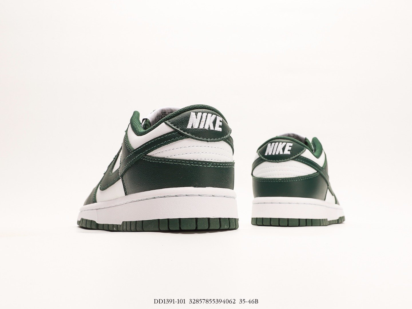The Nike Dunk Low Michigan State is composed of white leather uppers with Varsity Green leather overlays and Swoosh logos. From there, woven retro Nike logo tongue labels and heel embroidery nod to original Dunks from 1985.