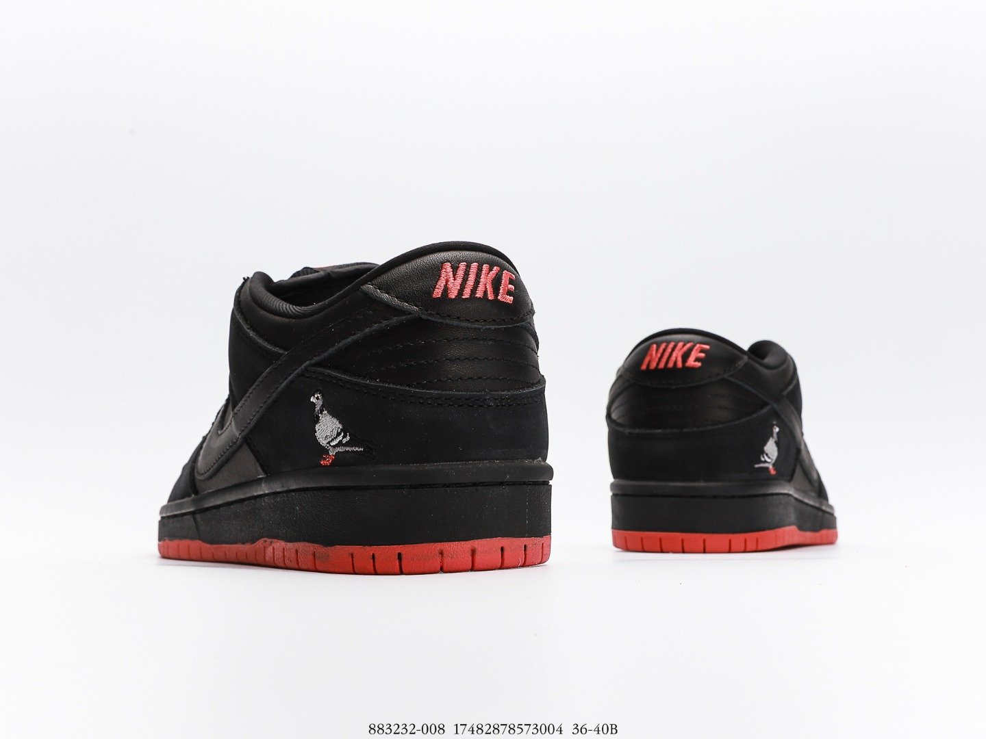 The leather upper of this Low Sb Dunk by Nike is black-colored and features the iconic highlights of Pigeon orange on the heel, at the outsole, as well as on the tongue. There is also a pigeon embroidered logo at the heel of this sneaker that boasts a classical low silhouette. The design is completed by laser engraving perforations.