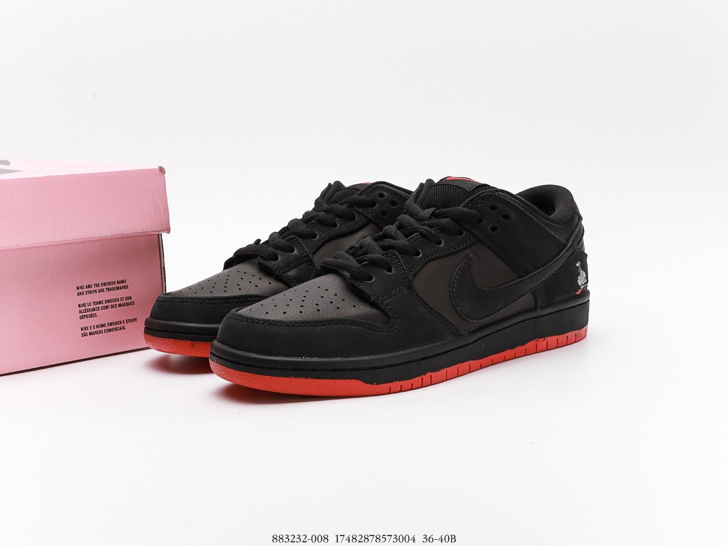 Black Nike Dunk Low sneakers with red soles and a pink shoebox.