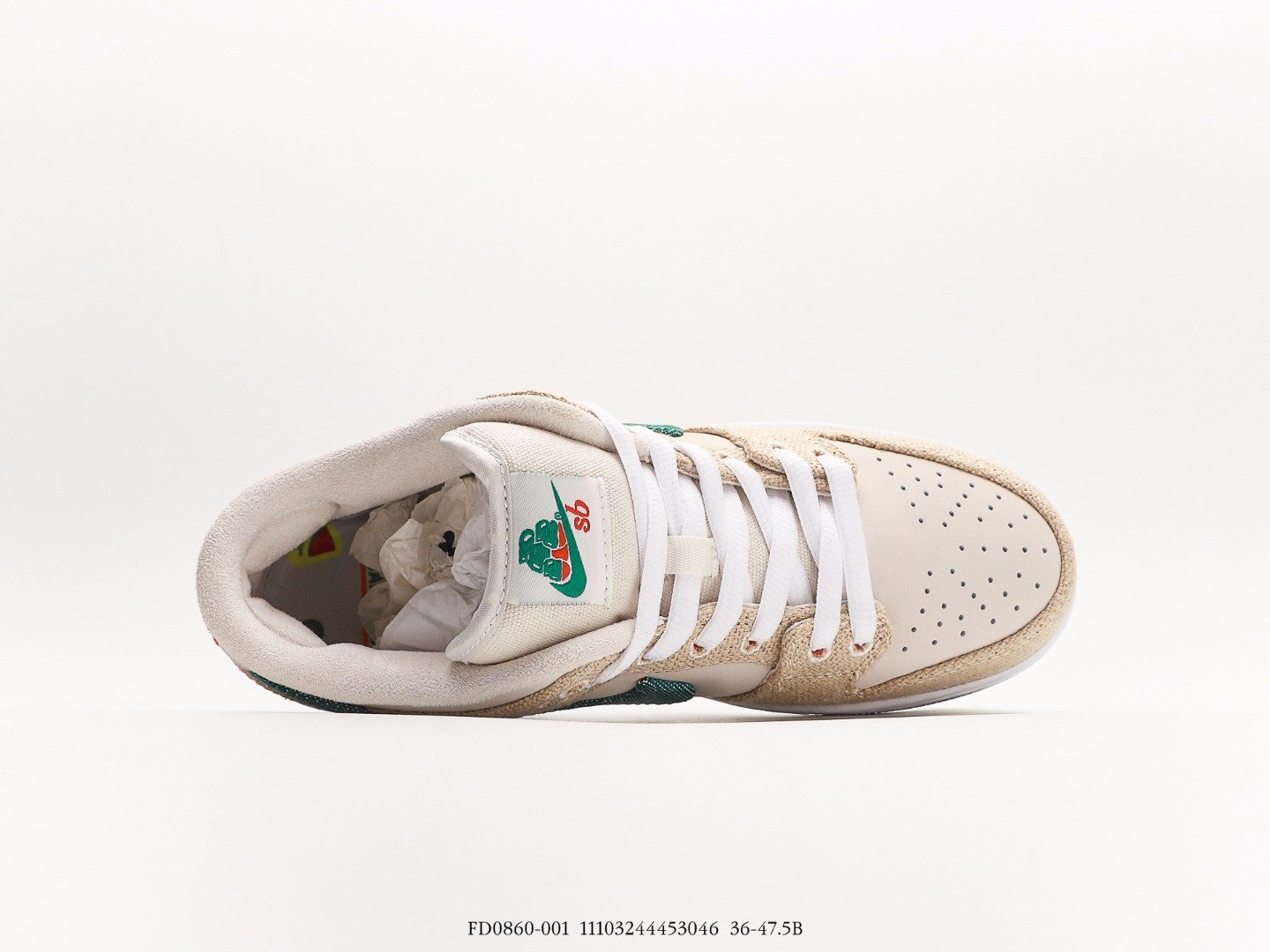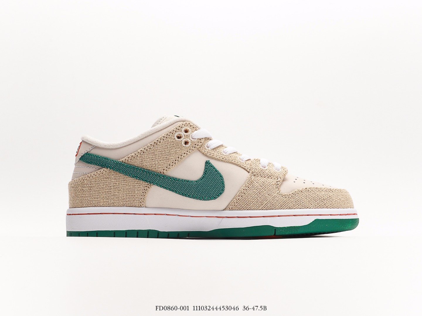 The Nike SB Dunk Low Jarritos is constructed using white leather and tear-away canvas materials across the uppers, while green accents help cover the outsoles and Nike Swoosh. Jarritos branding is seen throughout the insoles, heel tabs, and tongue of the sneakers. The limited edition sneakers come with orange, green, and white laces.