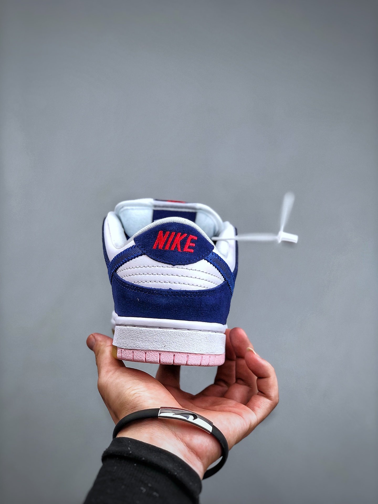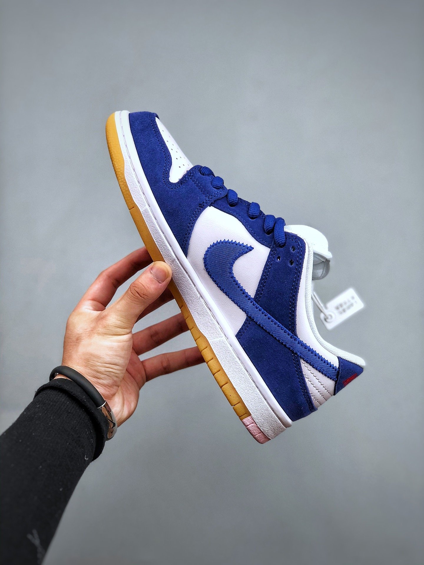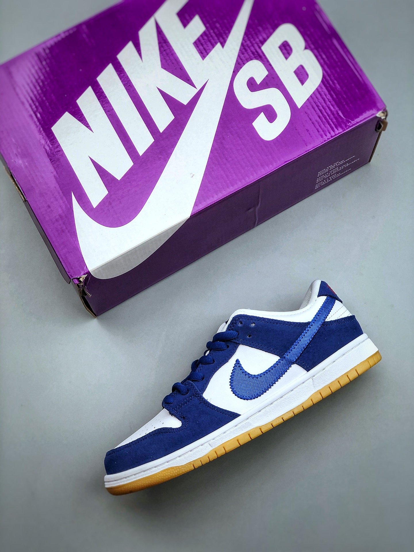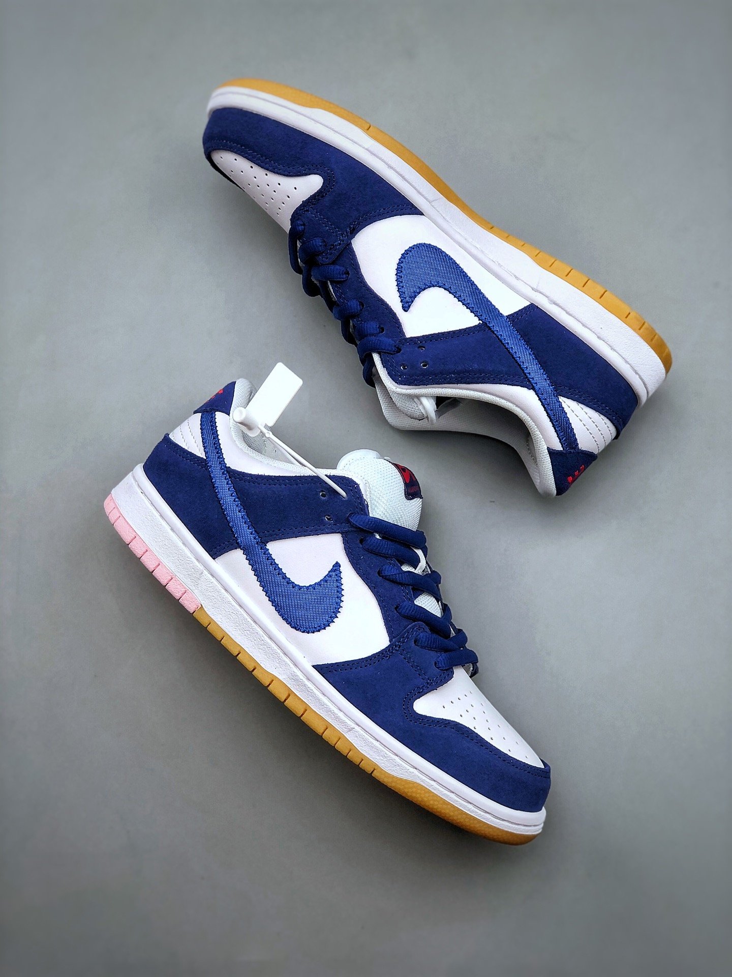 The Nike SB Dunk Low Los Angeles Dodgers is a low-top sneaker with lace-up closure style. The shoe features a blue and white color scheme that has shades similar to the traditional blue and white worn by the MLB’s LA Dodgers. It has a light-brown sole with a pink graphic on the ankle’s right side.