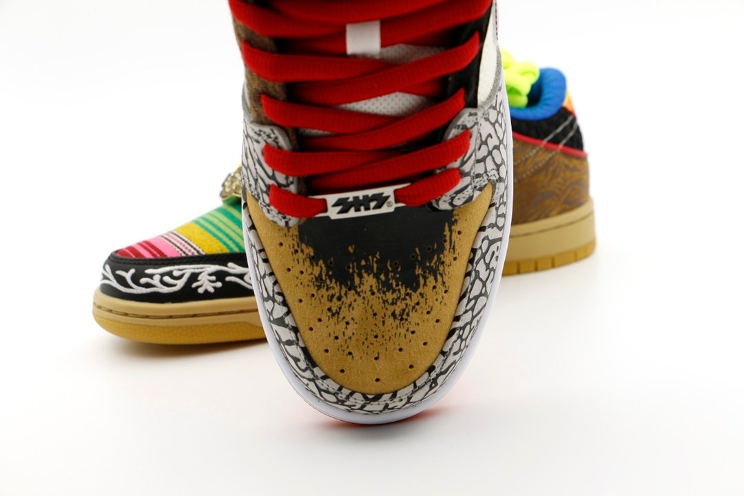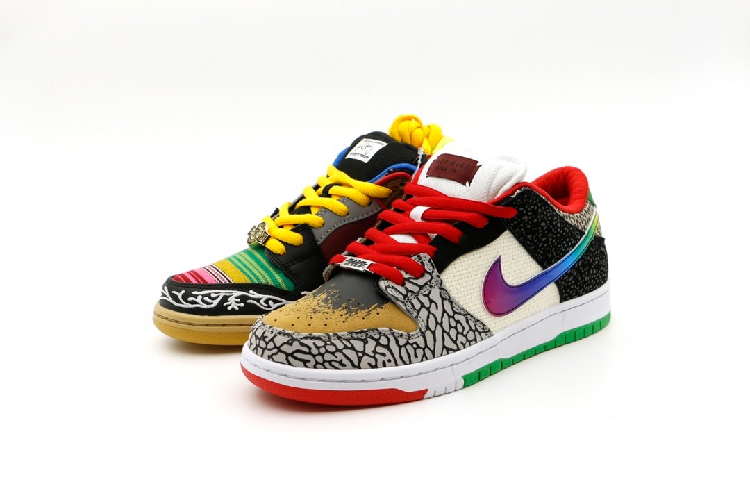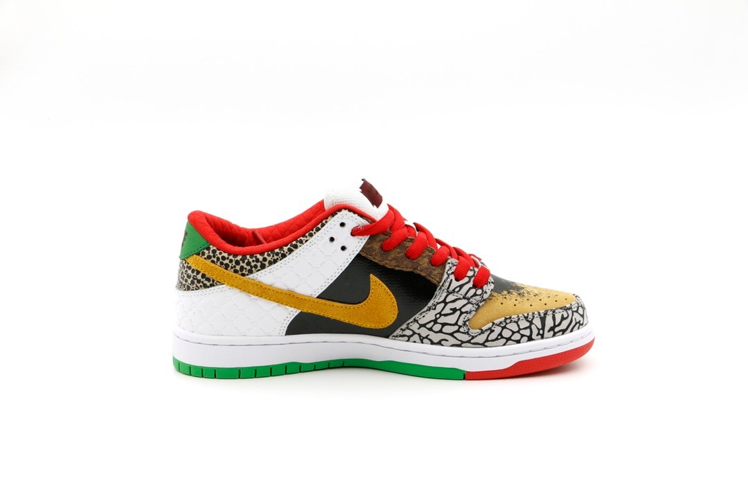 The Nike SB Dunk Low What The P-Rod pays homage to past Nike SB collaborations and releases from the P-Rod signature line. Its mismatched upper comes in an array of mesh, leather, suede, patent leather, and woven materials. Paul Rodriguez’s signature on the tongue and special edition metal deubrés complete the design.
