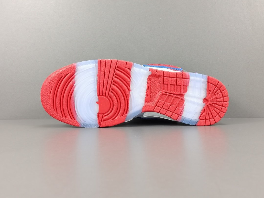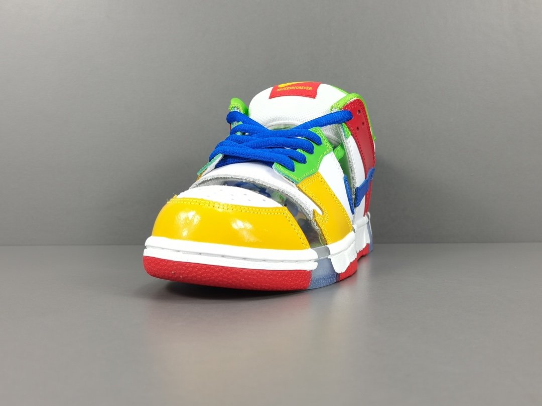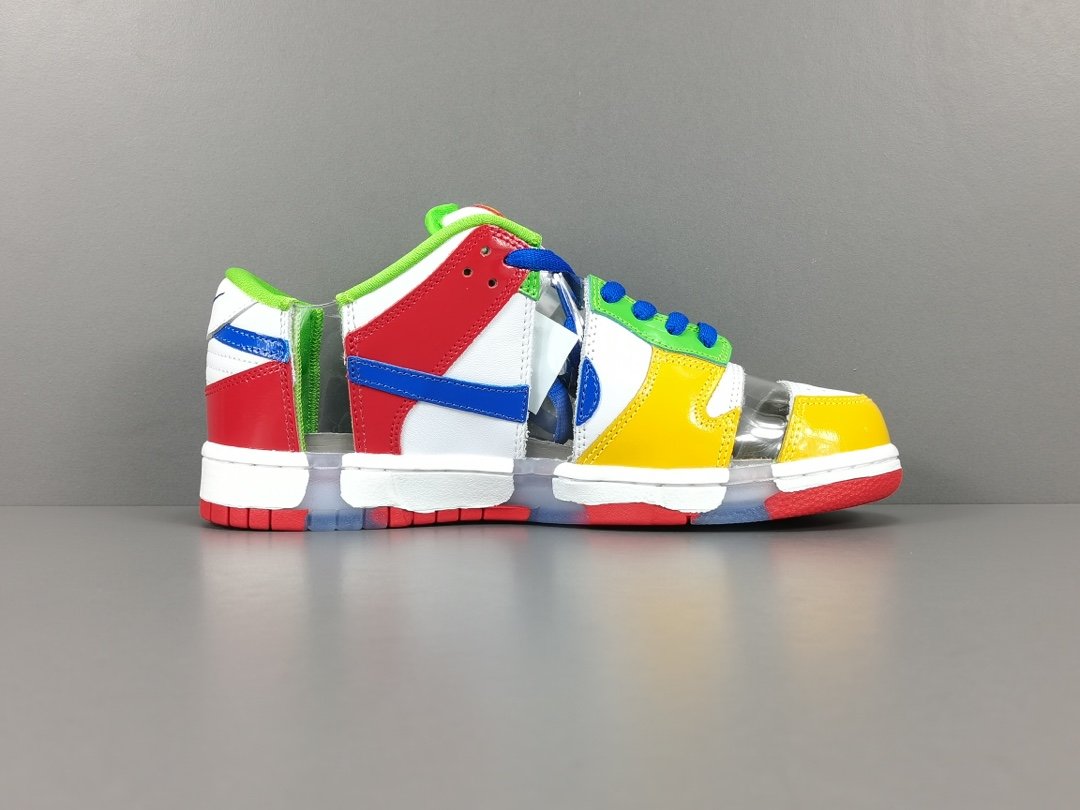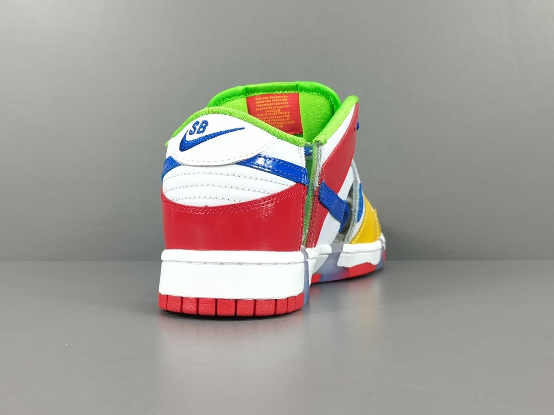 It has a white base with overlays in the company’s trademark red, green, blue, and yellow colors. The sneaker features clear stripes on its vamp, on the heel, and on the middle part. In addition, the shoe features a blue Nike Swoosh on both sides with an SB emblem on its heel panel. Its tongue panel is constructed with a padded cushion with a Nike Swoosh printed on it.