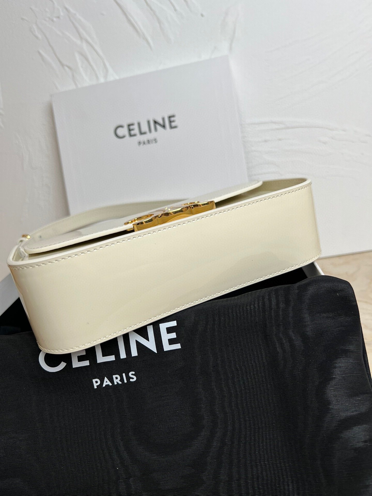 Black patent leather quilted handbag with gold chain and charm, comes with a long shoulder strap, against a decorative box background