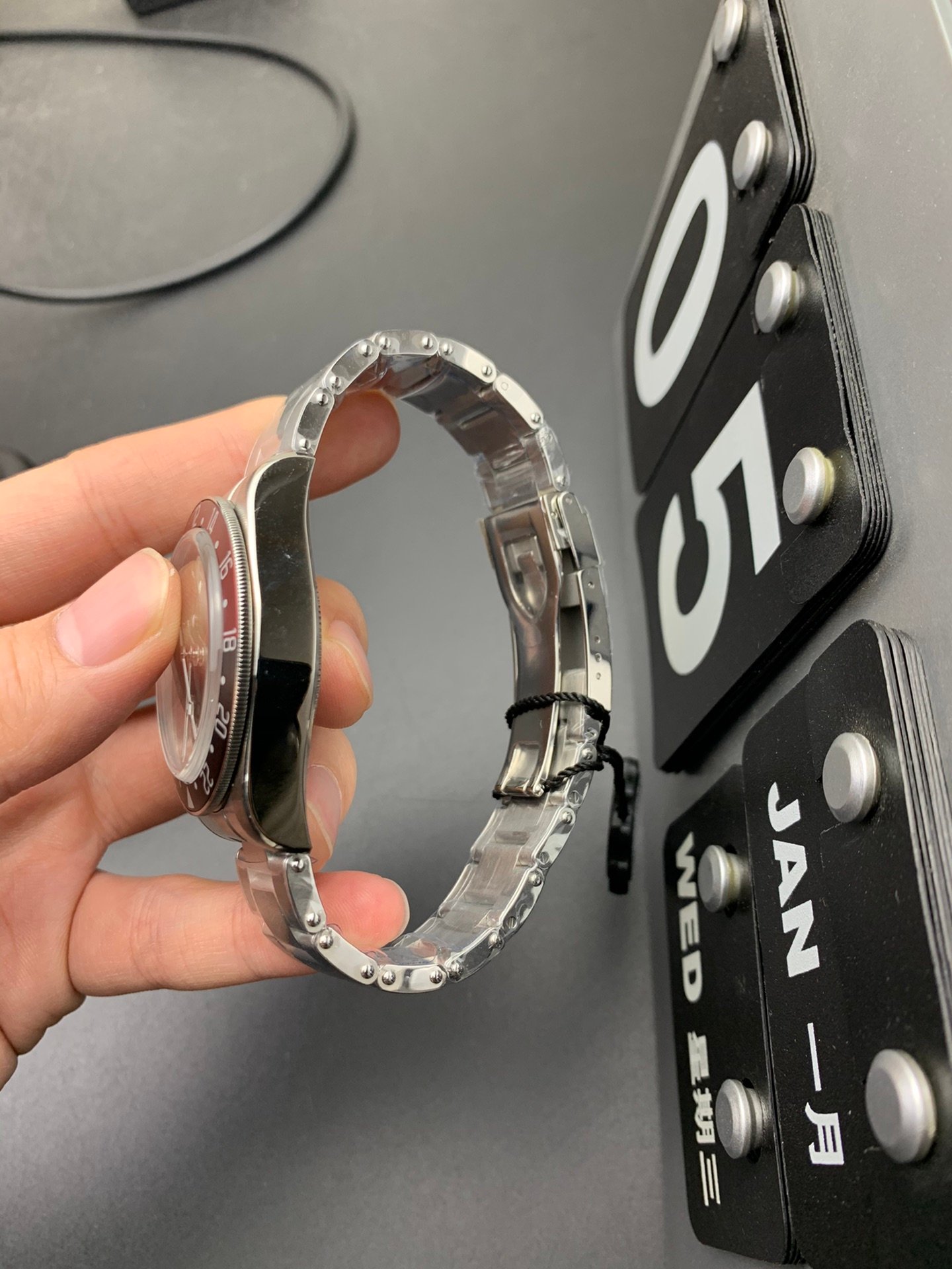 A wristwatch with a black dial and metal bracelet placed on a surface.