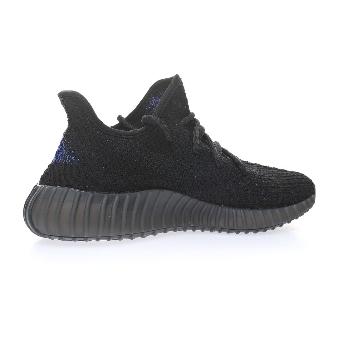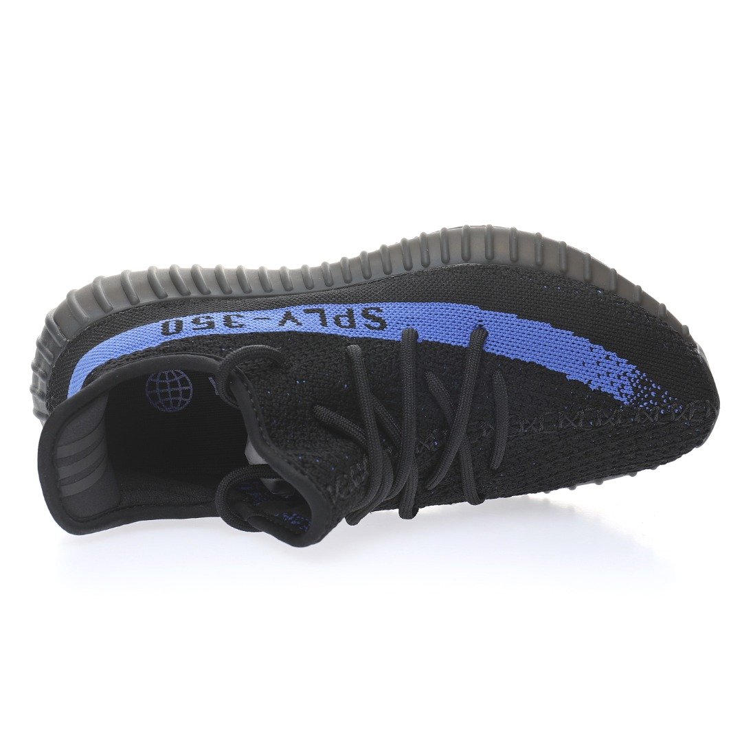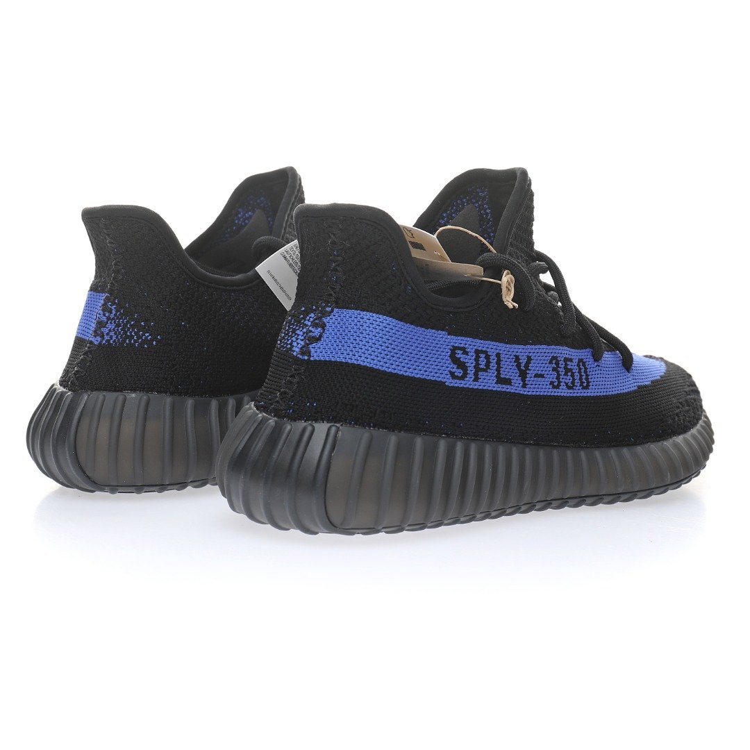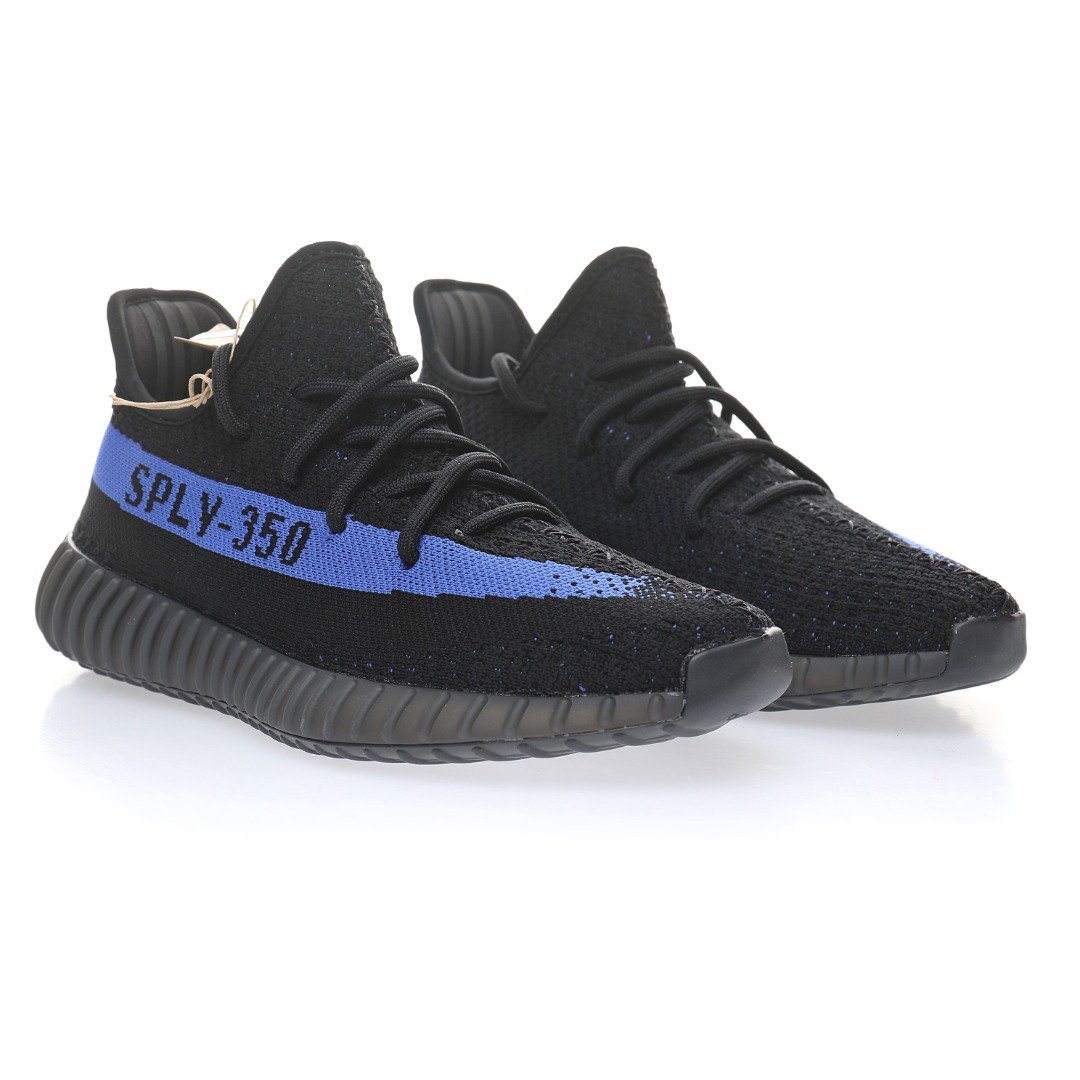 The adidas Yeezy 350 V2 Dazzling Blue is reminiscent of the 2016 Yeezy 350 V2 Black Friday Pack. Instead of featuring a marbled pattern and sheer side stripe, it opts for a solid black Primeknit upper and blue side stripe with “SPLY-350” text. At the base, a muted Boost sole offers comfort and support.